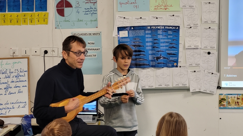 La matinée s’est terminée par une découverte de quelques instruments pratiqués dans les îles de l’océan (moana) Pacifique sud. Fabien, professeur d’éducation musicale et artiste dans l’âme, a joué quelques notes de ukulele tahitien et de flûte nasale, avant de proposer à toute l’assemblée d’entonner avec lui « Tarivera », un chant polynésien.