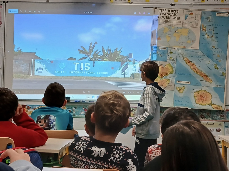 Aël, ancien élève de l’école des Ondines, vit désormais à Tahiti. De retour à Aunac pour les grandes vacances (c’est l’été dans l’hémisphère sud), il a tenu à passer à l’école pour retrouver ses ami.e.s pour leur dire « La ora na » et pour présenter un exposé sur sa nouvelle vie sous les tropiques.