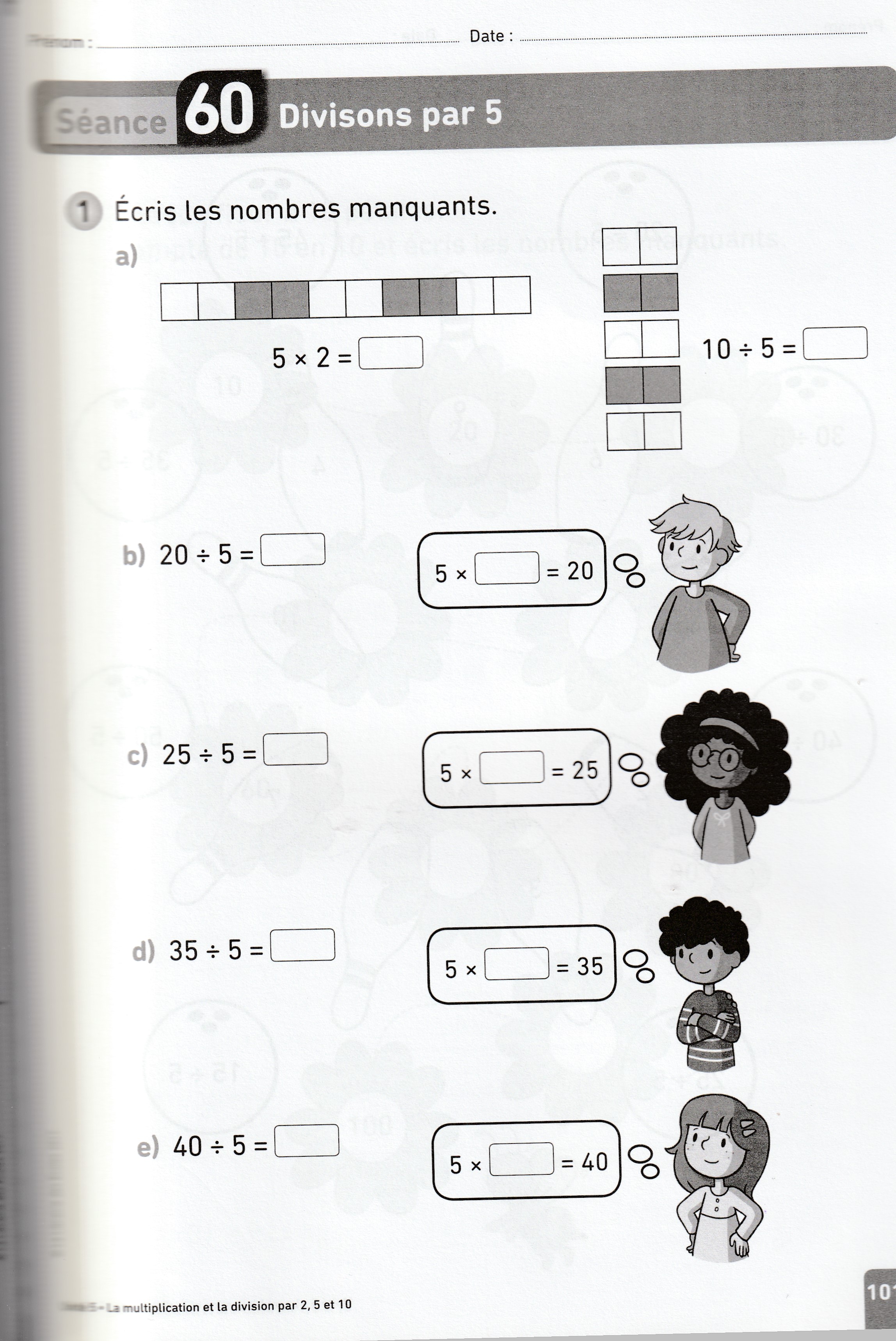 Division par 5 : AUjourd’hui, nous allons travailler la division par 5 MAIS attention en CE1 en aucun cas il n’est question d’apprendre la technique opératoire de la division qui relève des classes de CM. Ici il s’agit plus de partage. C’est comme cela que je leur enseigne, demandez-leur “diviser c’est faire quoi ?” normalement ils vont vous répondre c’est partager équitablement ou partager de manière égale, certains ne répondront que “partager” pour ces enfants il faut préciser “de manière égale”