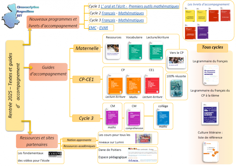 L’équipe de circonscription vous propose un document récapitulatif téléchargeable des textes et ressources officielles. Nous espérons qu’il vous permettra de retrouver facilement les documents et liens utiles pour organiser les enseignements.