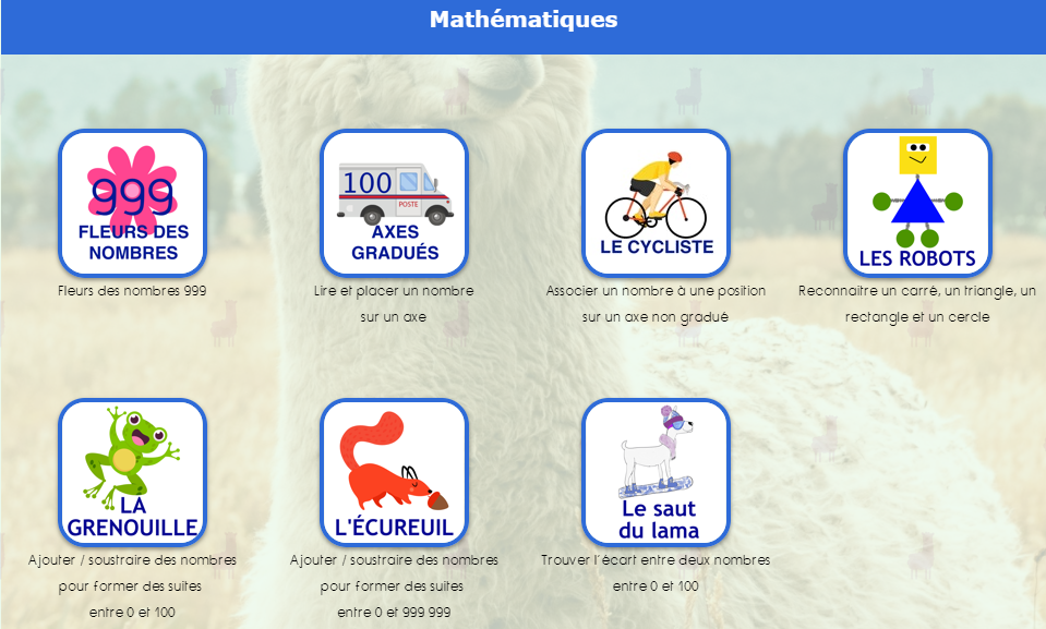 La classe du lama Applications cliquez sur la capture pour accéder au site La classe de Serge est un lieu de ressources en ligne qui regroupe plusieurs applications gratuites réparties par niveau et domaine, exemple en français niveau 1 : Autre exemple en maths, niveau 2 :