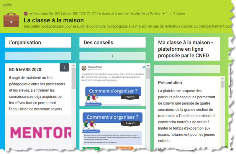 Plusieurs ressources sont présentées sur ce padlet initié par Mme Charpentier, IEN de Saintes. Il est complété au fur et à mesure des besoins exprimés par les utilisateurs. N’hésitez pas à contacter votre conseiller numérique pour lui faire part de vos besoins en matière de ressources ou formation.