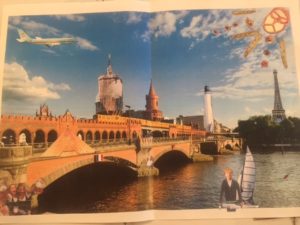 Il faut dire que les élèves de l’éco-école primaire bi-lingue avait rivalisé d’imagination pour réaliser leur oeuvre: un montage-collage qui mélange un paysage de Berlin avec des monuments français-rochelais et un personnage franco-allemand, représenté par un mixte de Mme Merkel et M. Holland, sur un catamaran sur la Spree… avec en prime tout un tas de petits indices sur les deux pays, Charlemagne avec la fleur de lys, l’aigle, le coq, le vin, la bière, la baguette, les bretzels…etc.Bravo et ce mot-là a le même sens en français et en allemand !
