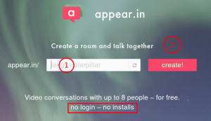 Si vous cherchez un service de visioconférence sans login et mot de passe, vous pouvez utiliser appear.in un site de visio gratuit en ligne. Pour cela il suffit de se rendre sur le site puis de donner un nom à sa visio ou salle de conférence. On clique sur le bouton “create” et un lien est généré. Vous envoyez ce lien par mail à vos correspondants. Vous pouvez ainsi établir une réunion par visio jusqu’à 8 personnes.