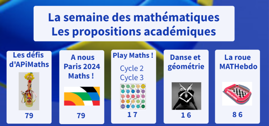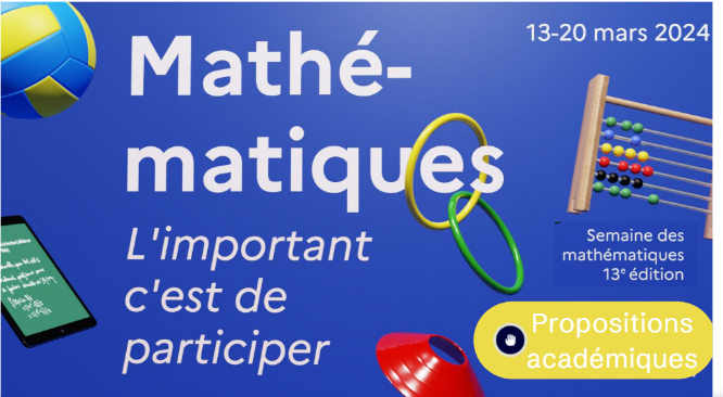 La semaine des mathématiques aura lieu du 13 au 20 mars et des ressources académiques qui vous ont été proposées via le lien du Genially : https://view.genial.ly/65c5de9bbc975b0014148bb9/presentation-semaine-des-mathematiques-2024