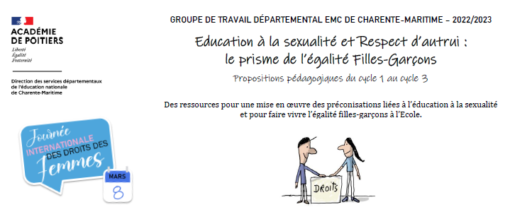 Voici un ensemble de ressources proposé par le groupe départemental EMC afin de vous aider à faire vivre l’éducation à la sexualité et le respect d’autrui via le prisme de l’égalité filles-garçons.