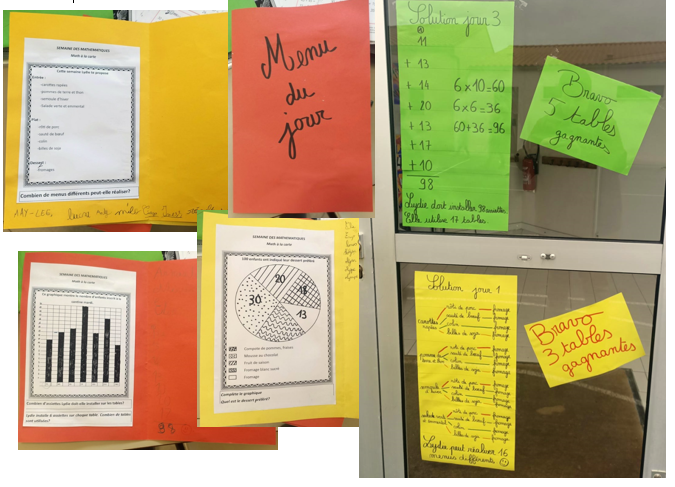 Saint Pierre la Noue – Marencennes : Pour la semaine des mathématiques, l’enseignante de la classe de CP/CE1 a proposé aux élèves de cycle 2, en partenariat avec l’équipe de restauration scolaire, une série de problèmes « à la carte ». Chaque jour, un menu contenant un problème attend les élèves sur leur table de cantine. Ils doivent alors échanger pour proposer une réponse à une situation réellement rencontrée par Lydie, la cantinière. Une proposition de résolution et le nombre de tables gagnantes sont donnés aux élèves par un affichage le lendemain.