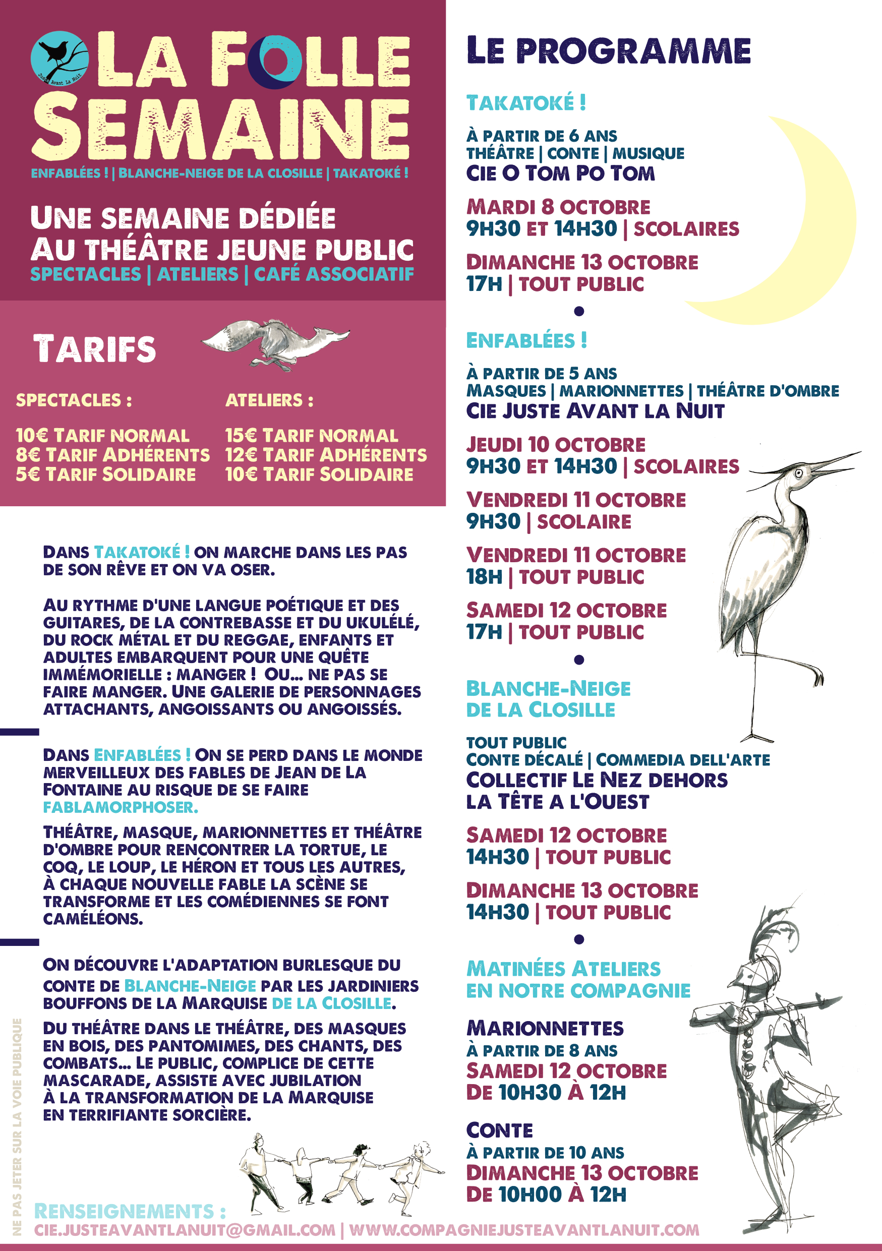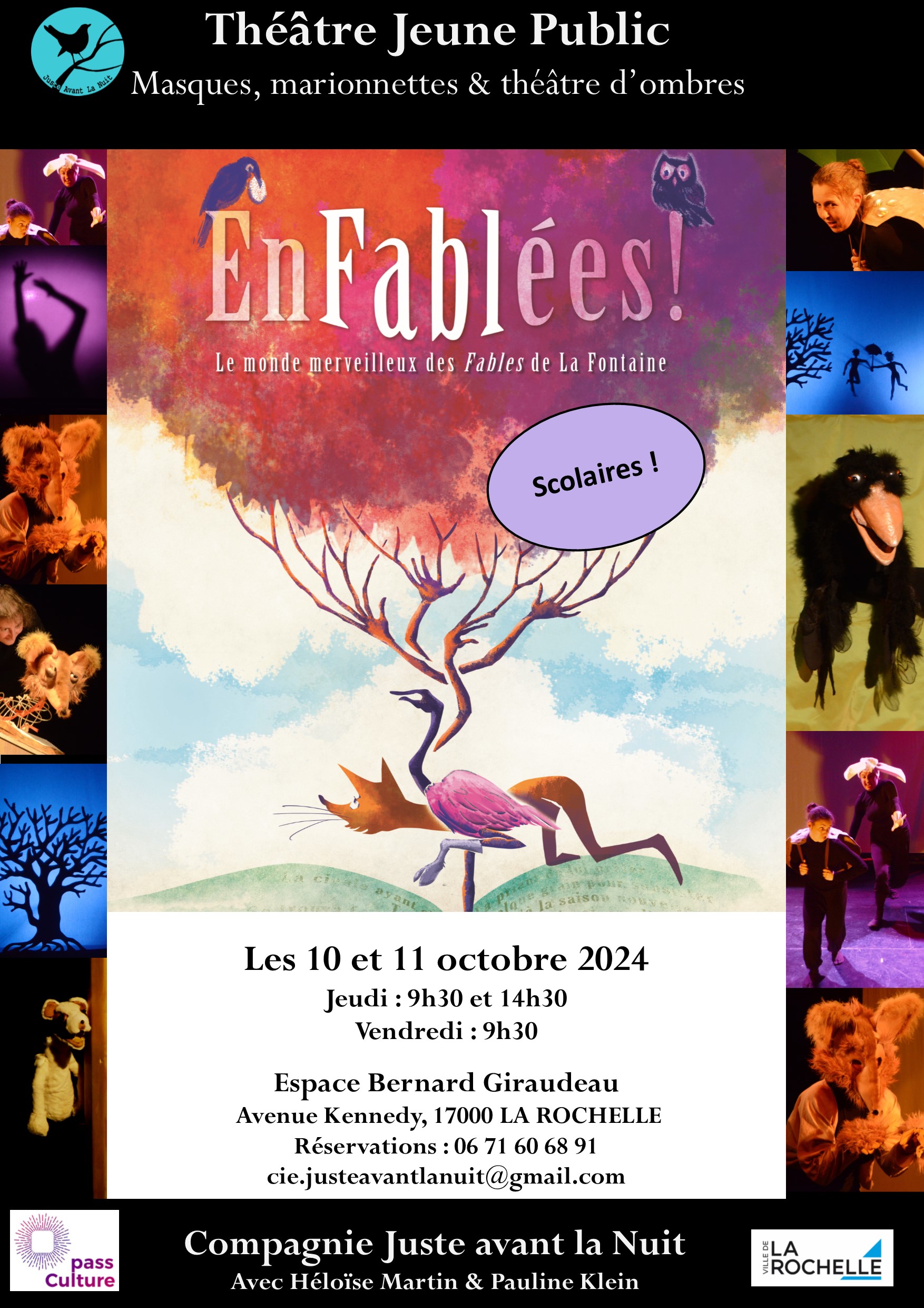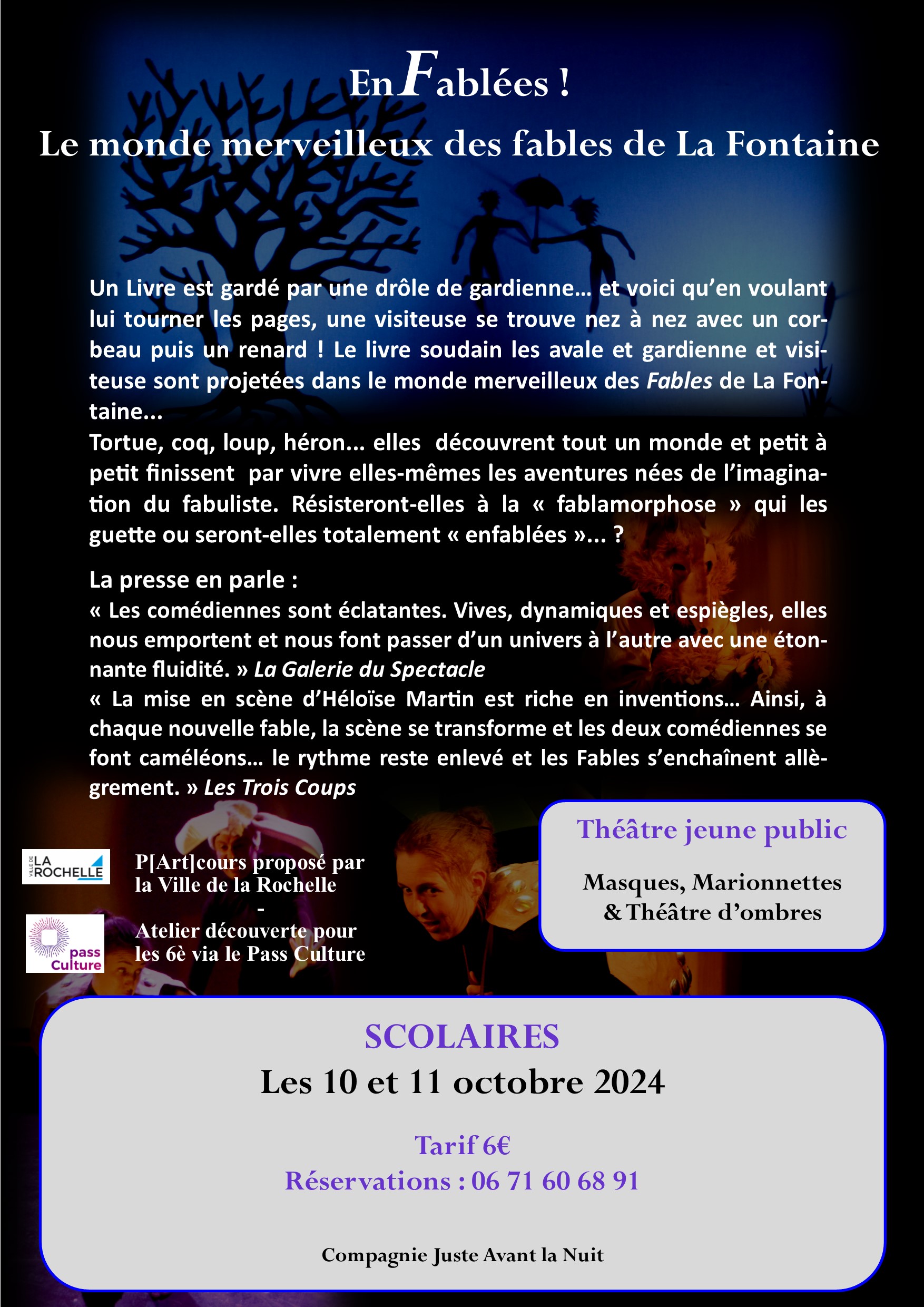 Dans le cadre de “La Folle semaine Jeune public” (programme complet en PJ), la Compagnie JUSTE AVANT LA NUIT jouera « Enfablées ! », son spectacle jeune public inspiré des Fables de La Fontaine. Tous les détails ci-dessous :