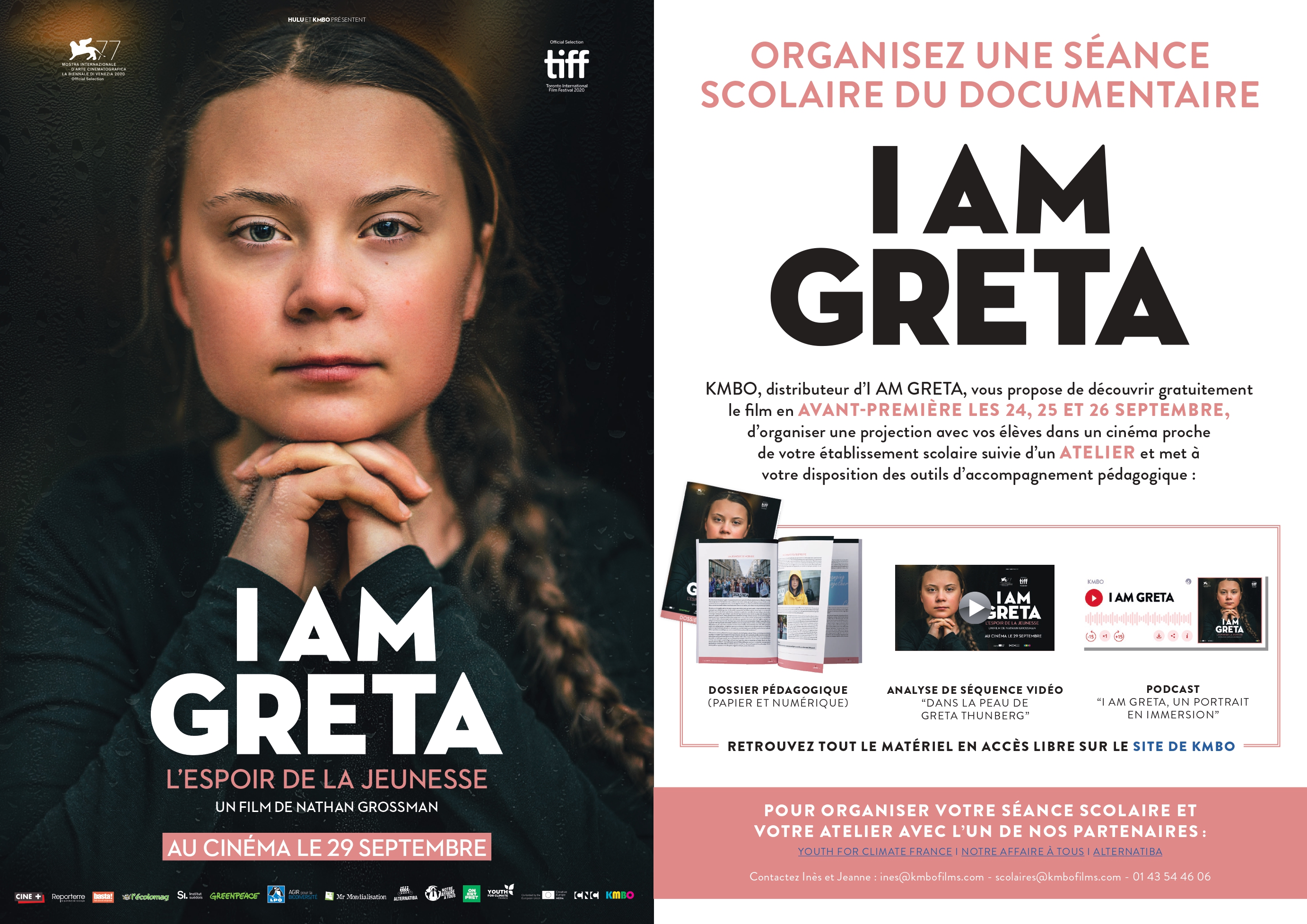 I AM GRETA, réalisé par Nathan Grossman, sortira dans les salles le 29 septembre 2021. Pour découvrir la bande annonce cliquez ICI. Un dispositif de gratuité en direction des professeurs des collèges et des lycées sera mis en place dans de nombreuses salles participantes, lors d’un grand week-end d’avant-premières les 24, 25 et 26 septembre prochains. Ces pré-séances permettront aux enseignant·es du 2nd degré de voir I AM GRETA dans les meilleures conditions de visionnement possibles avant, s’ils le souhaitent, de pouvoir faire découvrir le film à leurs élèves. Ce dispositif de gratuité est un outil conçu pour faciliter la rencontre des enseignant·es avec les films. Et participe ainsi à renforcer la politique d’éducation à l’image auprès des élèves. Pour organiser une séance scolaire dans une salle de cinéma, ou pour faire une demande de matériel pédagogique en version imprimée (également en libre téléchargement sur ce site), ne pas hésiter à contacter dès maintenant scolaires@kmbofilms.com. Il est d’ors et déjà possible d’écouter le podcast réalisé par KMBO autour d’I AM GRETA en cliquant ICI.