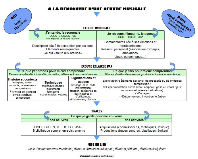 Quelques repères sur les différents niveaux d’écoute pour analyser et comprendre une œuvre musicale et des fiches d’aide à la mise en œuvre d’une écoute active.
