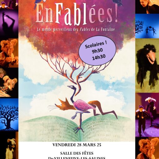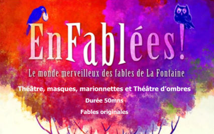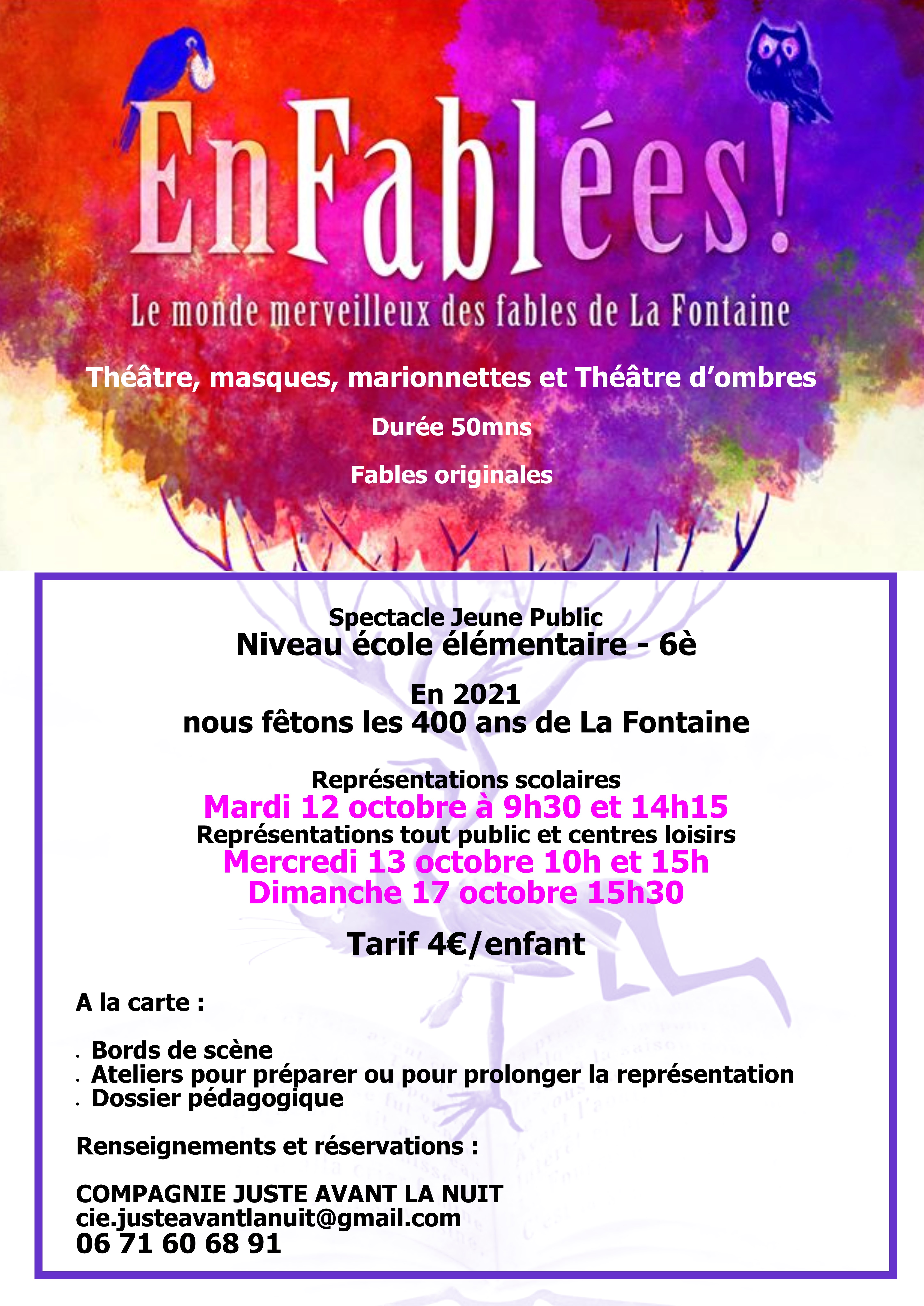 “Enfablées”, un spectacle avec marionnettes, masques et théâtre d’ombre, inspiré des Fables de La Fontaine (texte original). *2021 : 400e anniversaire de La Fontaine*. Public : CP CE1 CE2 CM1 CM2 6e – mardi 12 octobre (matin et après-midi).