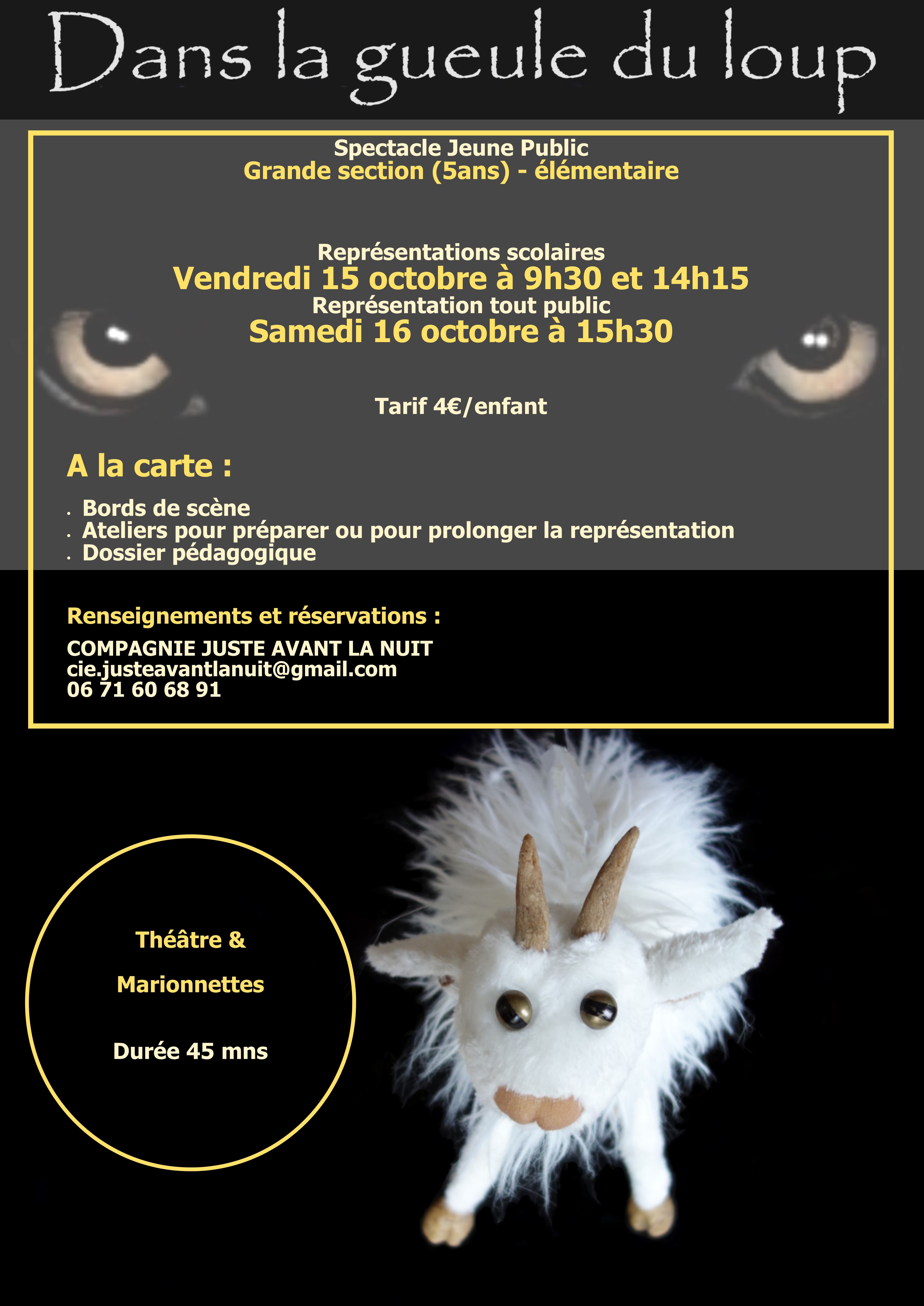 “Dans la Gueule du loup”, une proposition avec des marionnettes également, sur la peur du Loup et la peur de grandir. Cette pièce se tisse autour de 3 contes : “Marlaguette”, “Le Petit Chaperon rouge” et “La Chèvre de Monsieur Seguin”.