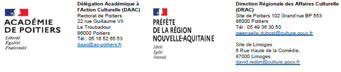 La Délégation Académique à l’Action Culturelle (DAAC) et la Direction Régionale des Affaires Culturelles Nouvelle Aquitaine (DRAC) ouvrent une deuxième session 2021 pour l’appel à projets en Éducation Artistique et Culturelle auprès des écoles, collèges et lycées publics de l’Académie de Poitiers. Toutes les informations en pièce jointe dans le cahier des charges.
