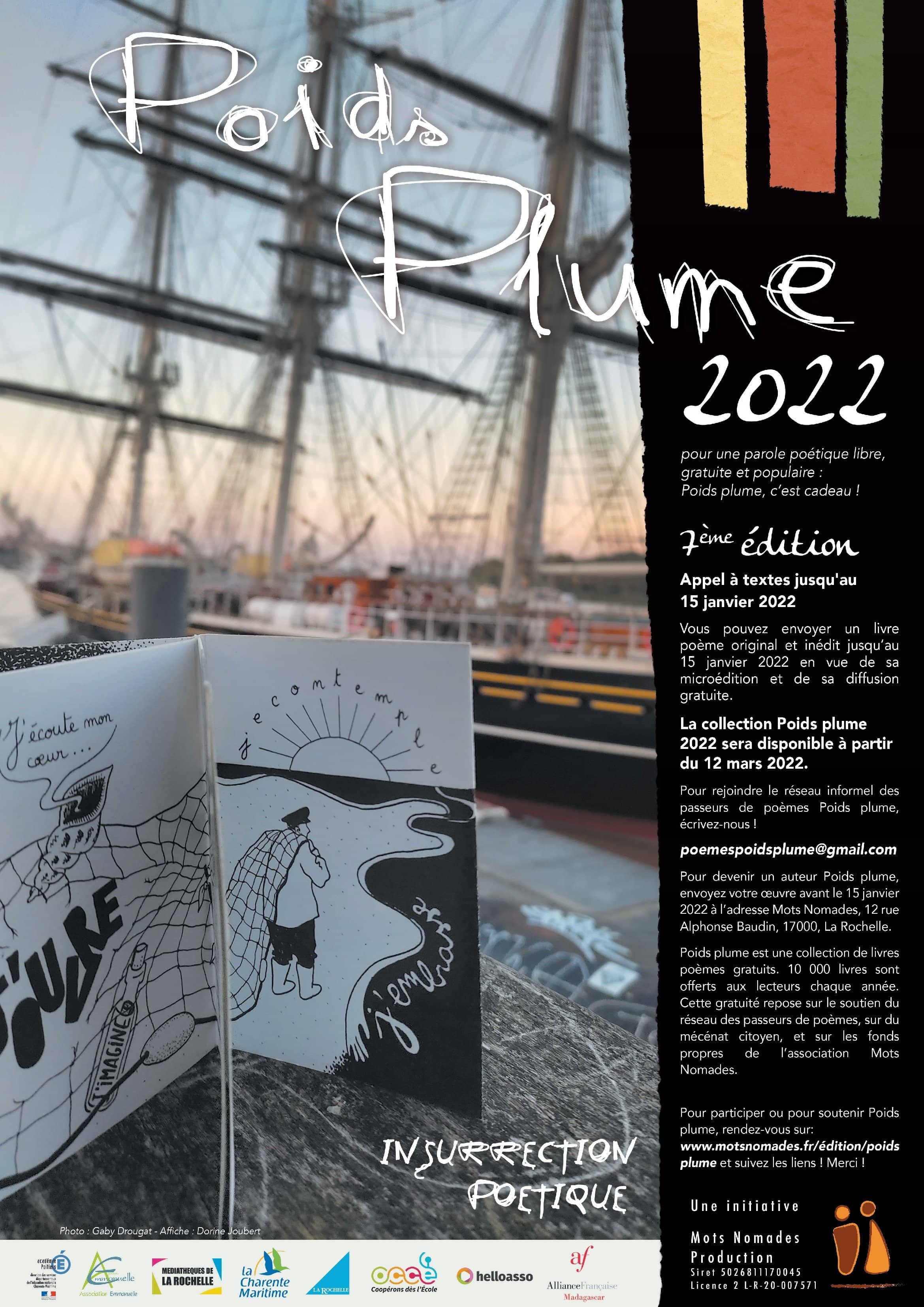 L’appel à textes de Poids plume, c’est une invitation à créer de très petits livres de poèmes, en vue de leur possible édition et diffusion lors du Printemps des poètes 2022. Cette invitation à écrire s’adresse à toutes et tous, à tout âge. Cette proposition a pour objectif de stimuler l’envie d’écrire, l’imaginaire, et la motivation qui consiste à écrire pour être lu. Toutes les modalités de participation sont indiquées dans les documents joints. Pour toute question relative à cette proposition, contacter : poemespoidsplume@gmail.com.