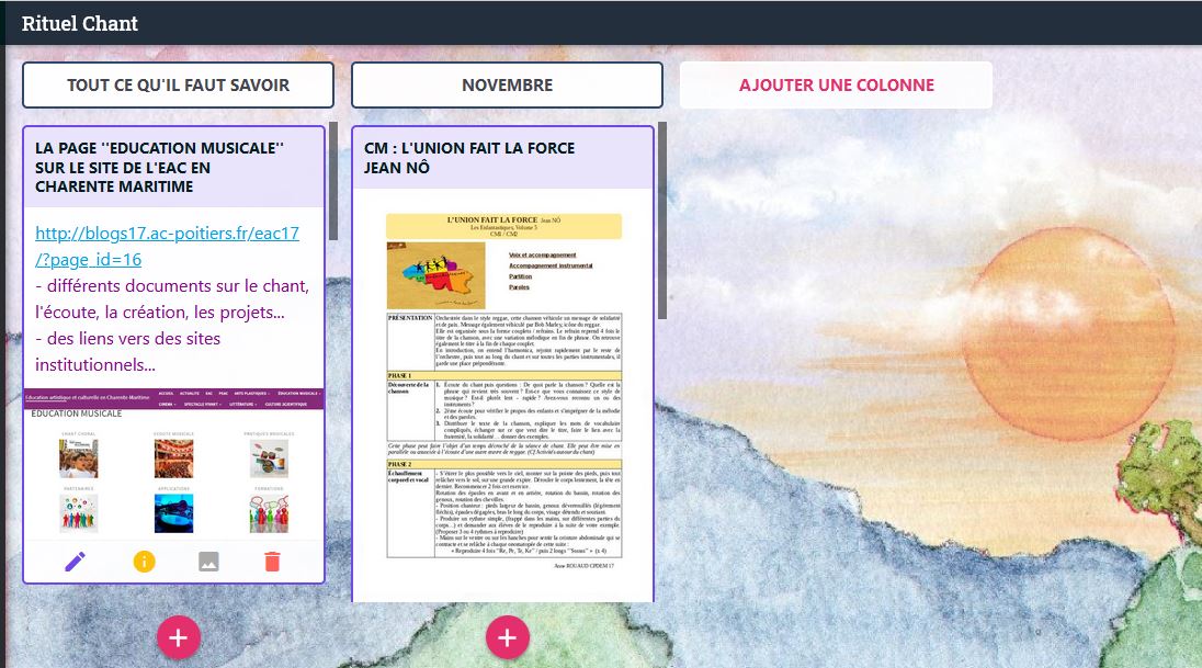 Au début de chaque mois, vous trouverez dans ce padlet des séquences de chant pour tous les niveaux de classe. (partitions, supports voix, accompagnements instrumentaux, activités complémentaires…)