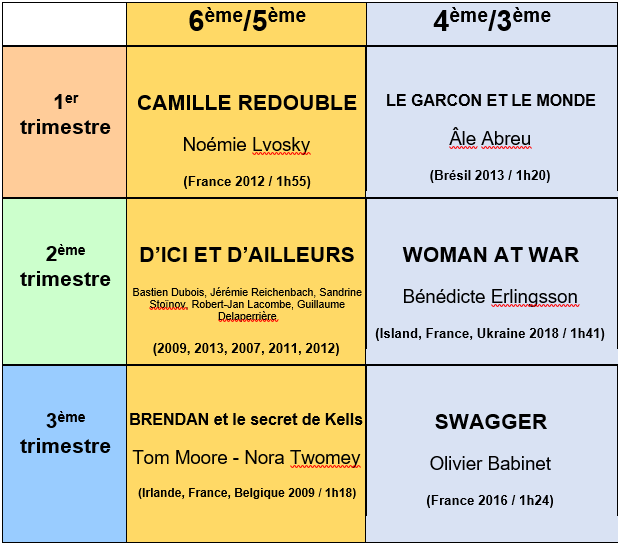 Réduire les stages Collège au cinéma à deux heures ne permettant pas une véritable formation pédagogique, seuls les 2 premiers films de la programmation seront donc accompagnés avec 3 heures de formation. Pour le film du troisième trimestre les fiches CNC seront à disposition sur le site de la DAAC.