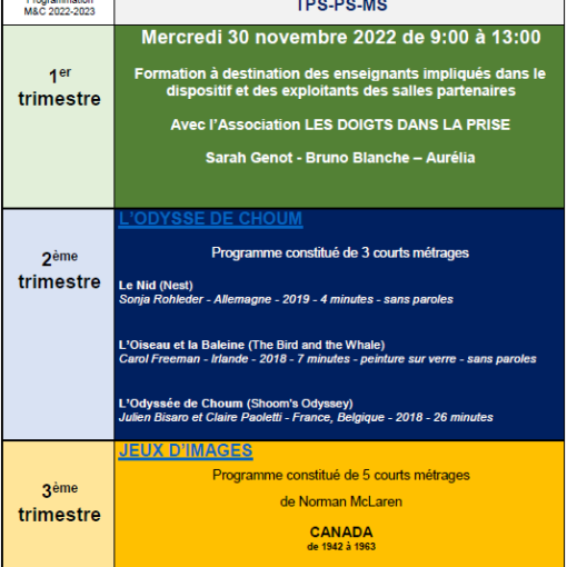 - à partir de l’année scolaire 2023-2024, seules les classes de Cycles II et III pourront s’inscrire au dispositif École et Cinéma. Un film par trimestre sera proposé aux classes inscrites.