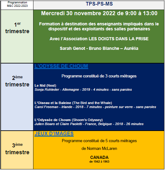 - les classes de Cycle I s’inscriront obligatoirement au dispositif Maternelle au cinéma. Les classes de GS assisteront à 3 films dans l’année (1 par trimestre) / alors que les classes de PS et de MS films assisteront à 2 séances.