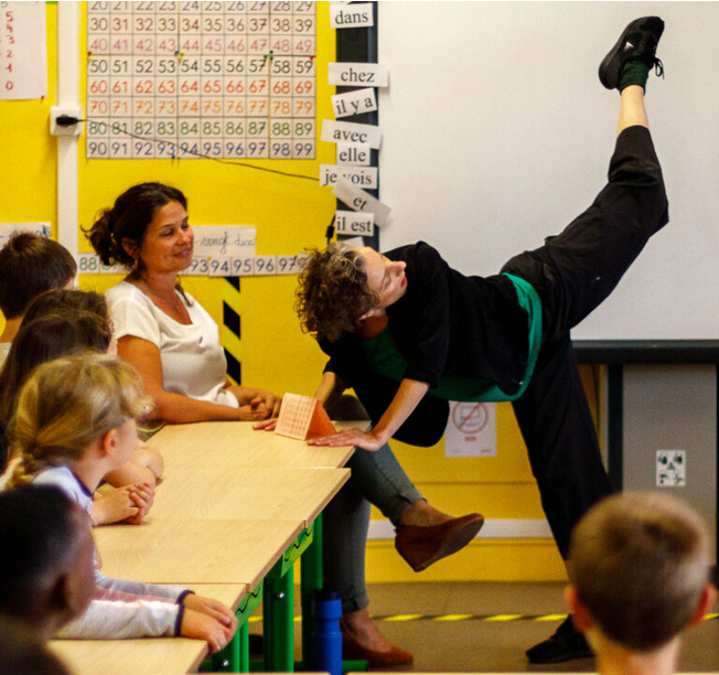 - En début de semaine, un temps de “rencontre dansée” avec l’ensemble de l’équipe de l’école (enseignants, ATSEMs, IEN, personnels péri-scolaire et personnels technique). Les participants.tes seront amené·e·s doucement dans l’univers de la danse et plus spécifiquement dans celui de la compagnie, joyeux et loufoque.
