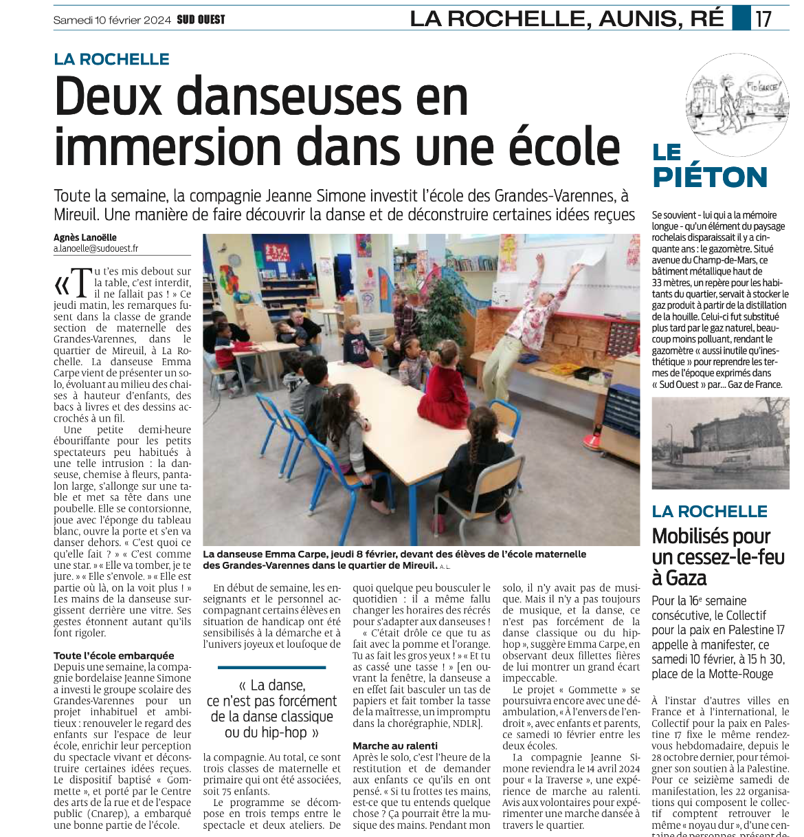 Du lundi 5 au samedi 10 février 2024, deux danseuses de la compagnie JEANNE SIMONE prendront leurs quartiers dans l’école des Grandes Varennes, située dans le quartier de Mireuil à La Rochelle. Elles vivront ainsi une semaine “Gommette”, en complète immersion avec les enfants et les adultes de l’école.
