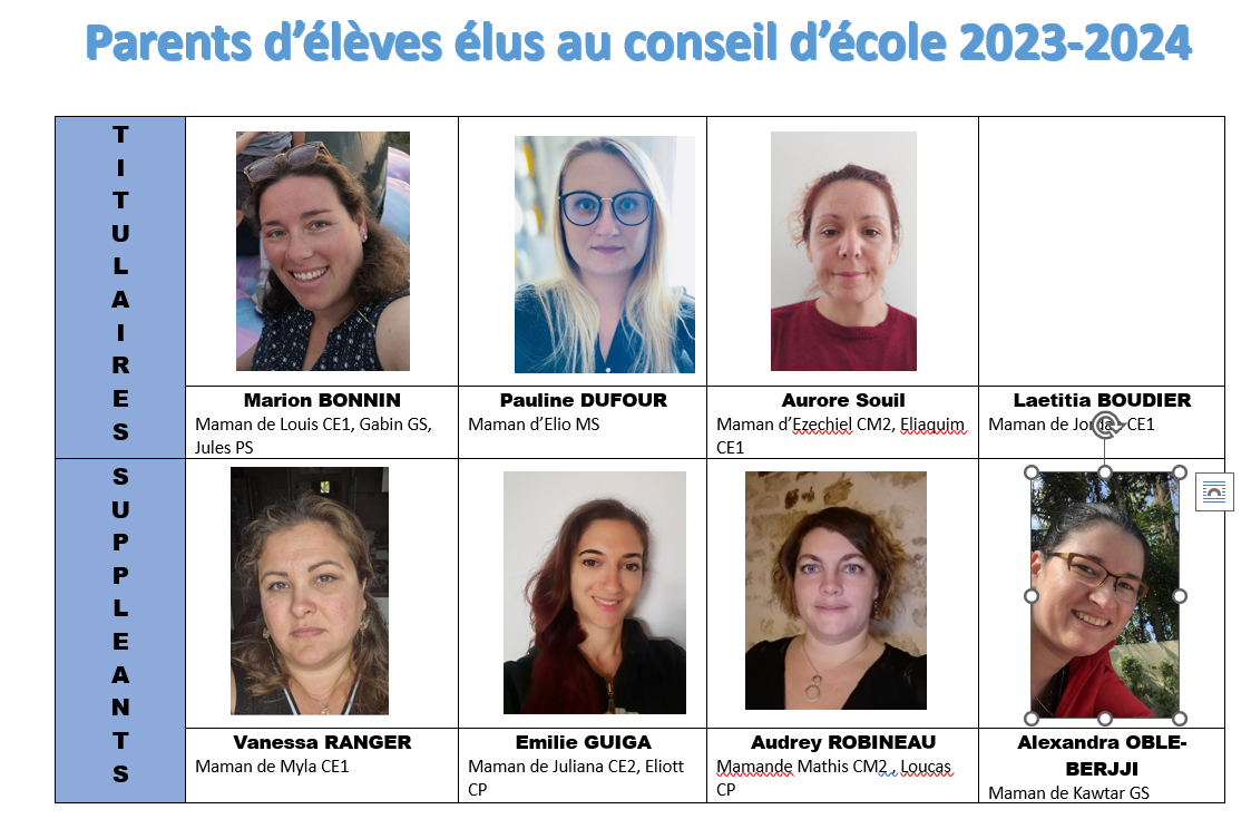 Voici un trombinoscope des parents élus au conseil d’école pour cette nouvelle année scolaire. Vous pouvez vous tourner vers eux pour faire remonter des informations lors des conseils d’école qui se tiendront :
