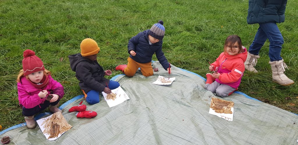 Je partage une partie de notre matinée dehors. Ce matin, après notre séance de motricité, nous avons fait une séance d’arts visuels. Nous avions emporté des feuilles blanches, des pinceaux mais nous avions oublié la peinture 😉, alors comment faire ? Nous avons réfléchi et eu une idée : peindre avec de la boue, un mélange de terre et d’eau ! C’était trop bien !