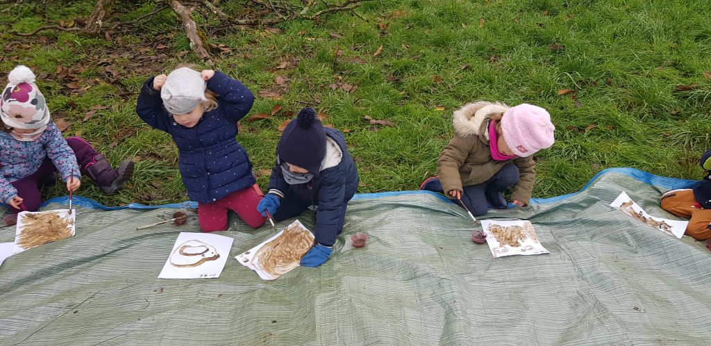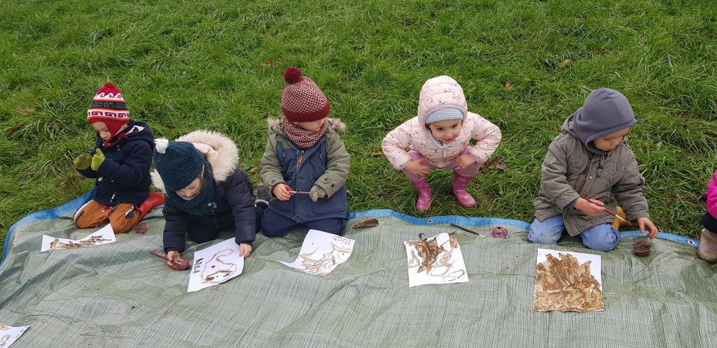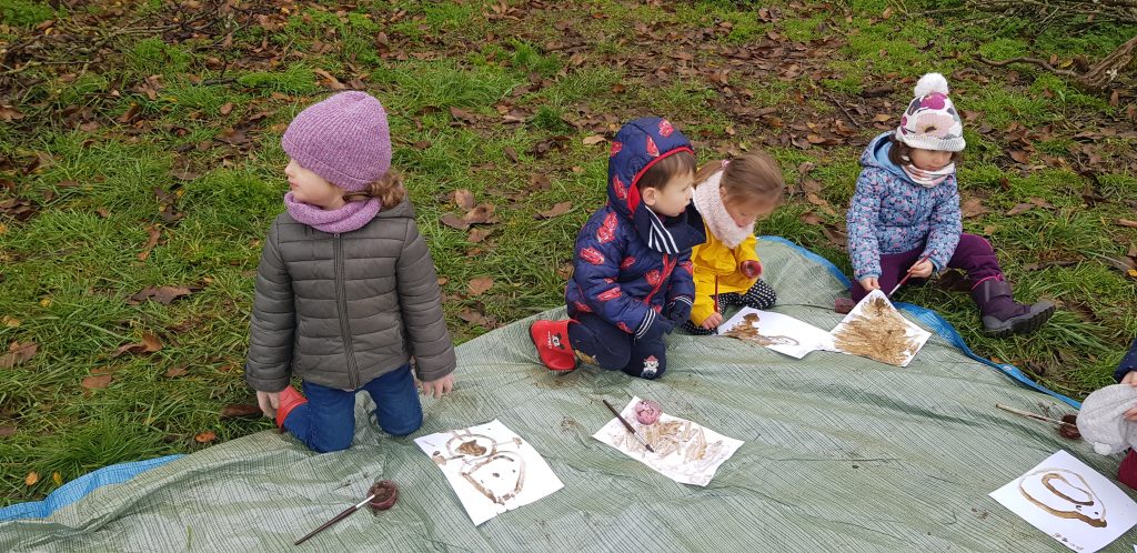 Je partage une partie de notre matinée dehors. Ce matin, après notre séance de motricité, nous avons fait une séance d’arts visuels. Nous avions emporté des feuilles blanches, des pinceaux mais nous avions oublié la peinture 😉, alors comment faire ? Nous avons réfléchi et eu une idée : peindre avec de la boue, un mélange de terre et d’eau ! C’était trop bien !