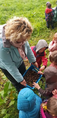 En quittant notre noyer, nous avons trouvé des glands. Ils viennent des chênes. Les sangliers en mangent. Nous en avons ramassé pour nos activités de manipulation, de langage et de numération en classe.