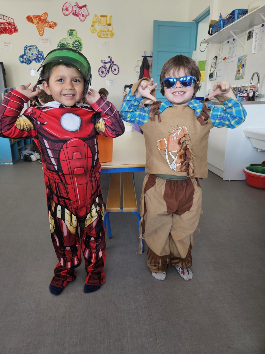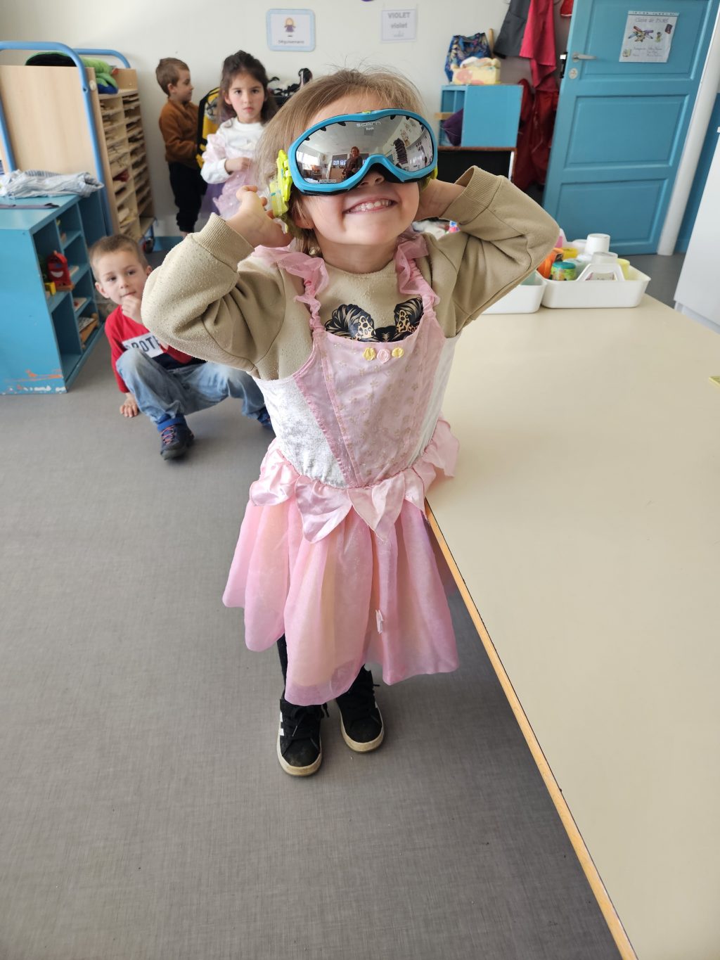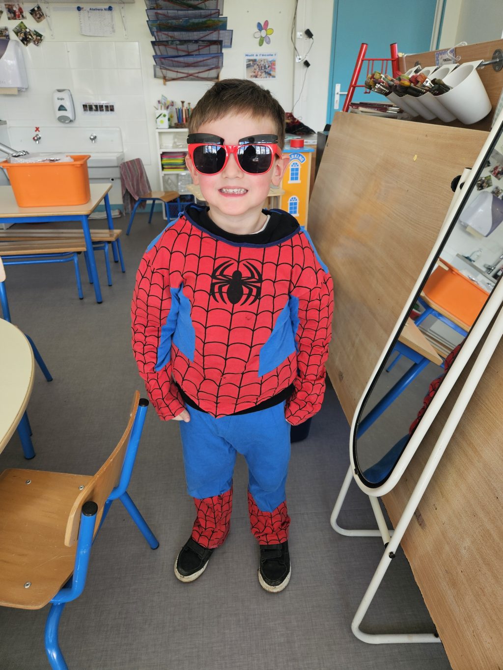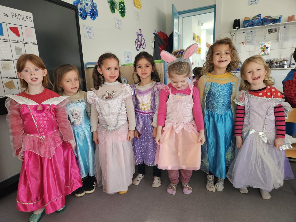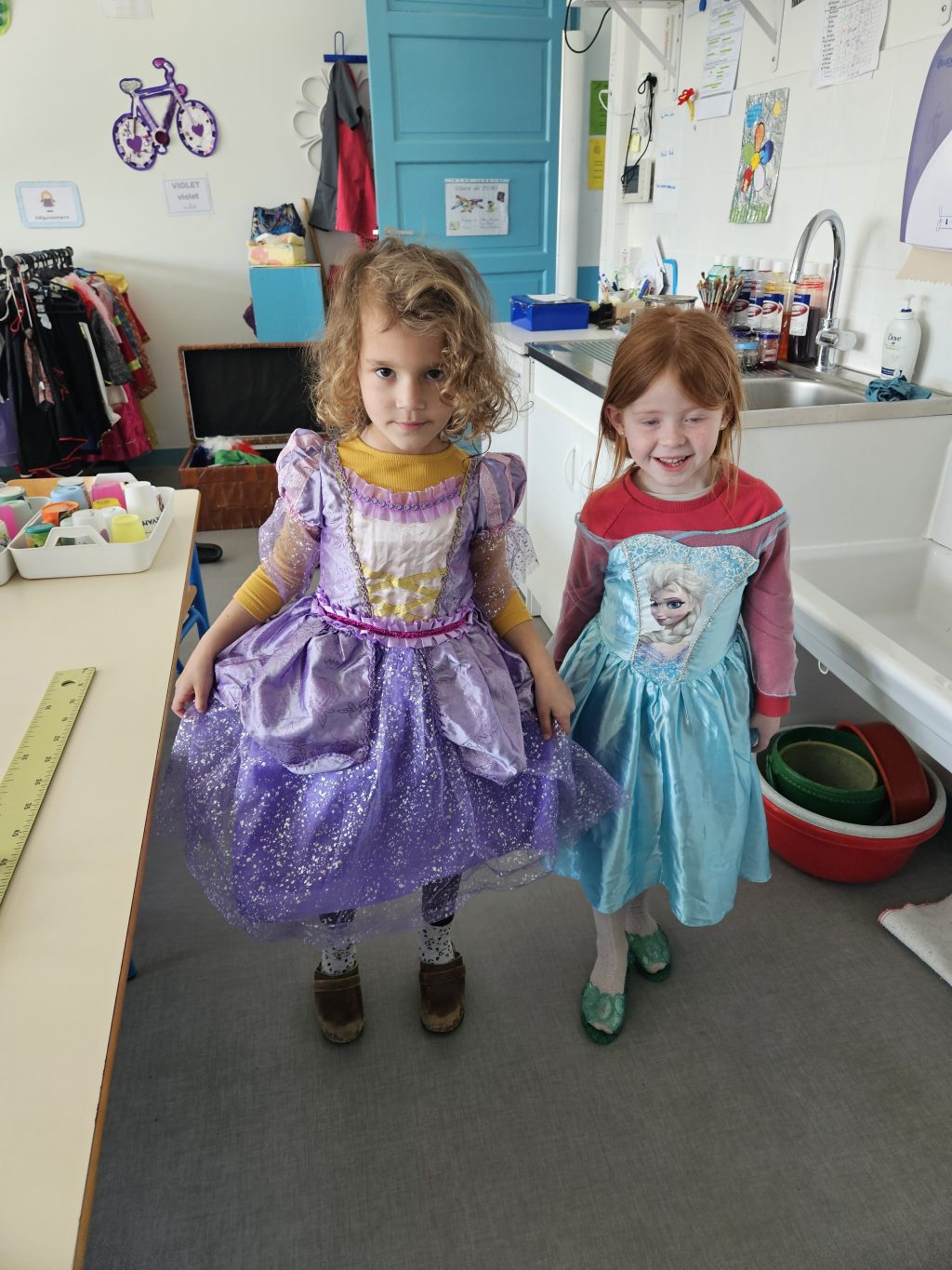 Chacun peut essayer et associer comme il le veut ! Les garçons peuvent se déguiser en princesse et les filles en spiderman ! C’est drôle ! Et on verbalise, on explique comment on s’est déguisé et avec quels accessoires.