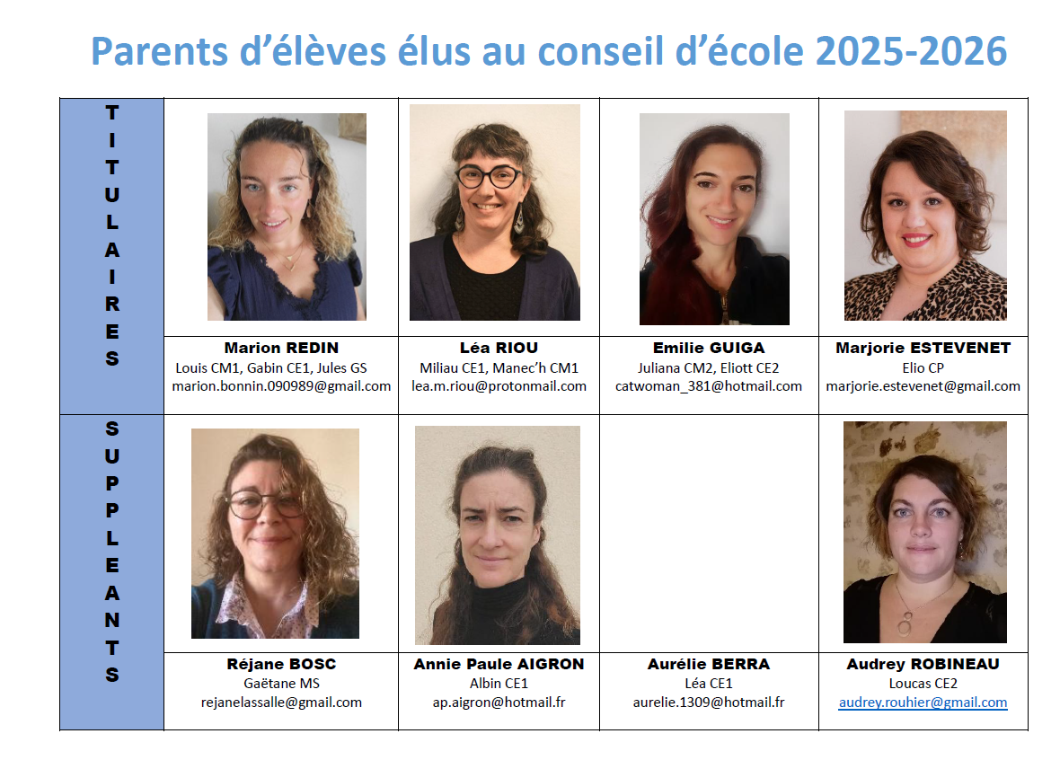 Voici donc le trombinoscope des parents élus cette année. Vous pourrez associer un visage au nom et également accéder aux adresses méls si vous le souhaitez.