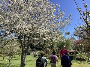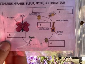 Il fallait aller de la balise 1 à la 18 : on a cueilli des fleurs, deviné le nom d’un arbre, appris que les abeilles et les papillons sont des insectes pollinisateurs : ils transportent le pollen de fleur en fleur (une abeille peut sentir les odeurs jusqu’à 800m).