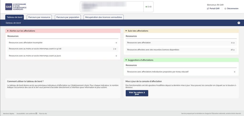 La gestion des ressources “compatibles GAR” est réalisée, par les RA (Responsables d’Affectation), dans l’outil d’affectation des ressources (console d’affectation). Pour y accéder, il suffit de cliquer sur le connecteur GAR Module d’affectation présent dans Mes applis de l’ENT. Ce lien est visible des personnes auxquelles cette fonction a été déléguée par le chef d’établissement (voir plus bas dans l’article).
