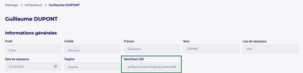 L’information se trouve dans le champ identifiant CAS de la fiche de l’utilisateur (Pilotage > Utilisateurs > Cliquer sur le nom de l’utilisateur pour afficher la fiche utilisateur).