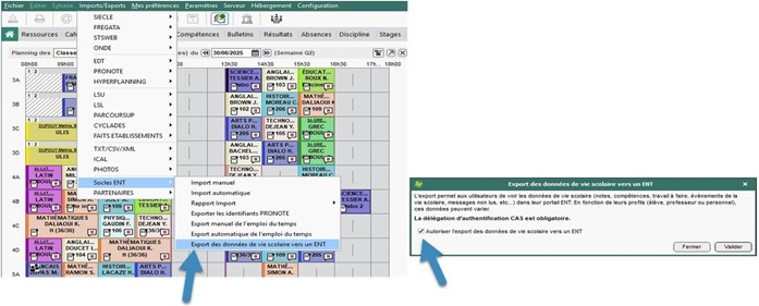 Action à réaliser dans Pronote : sélectionner le menu “Imports/Exports > Socles ENT > Export des données de la vie scolaire vers un ENT” puis cocher “Autoriser l’export des données de vie scolaire vers un ENT” dans la fenêtre qui s’ouvre.