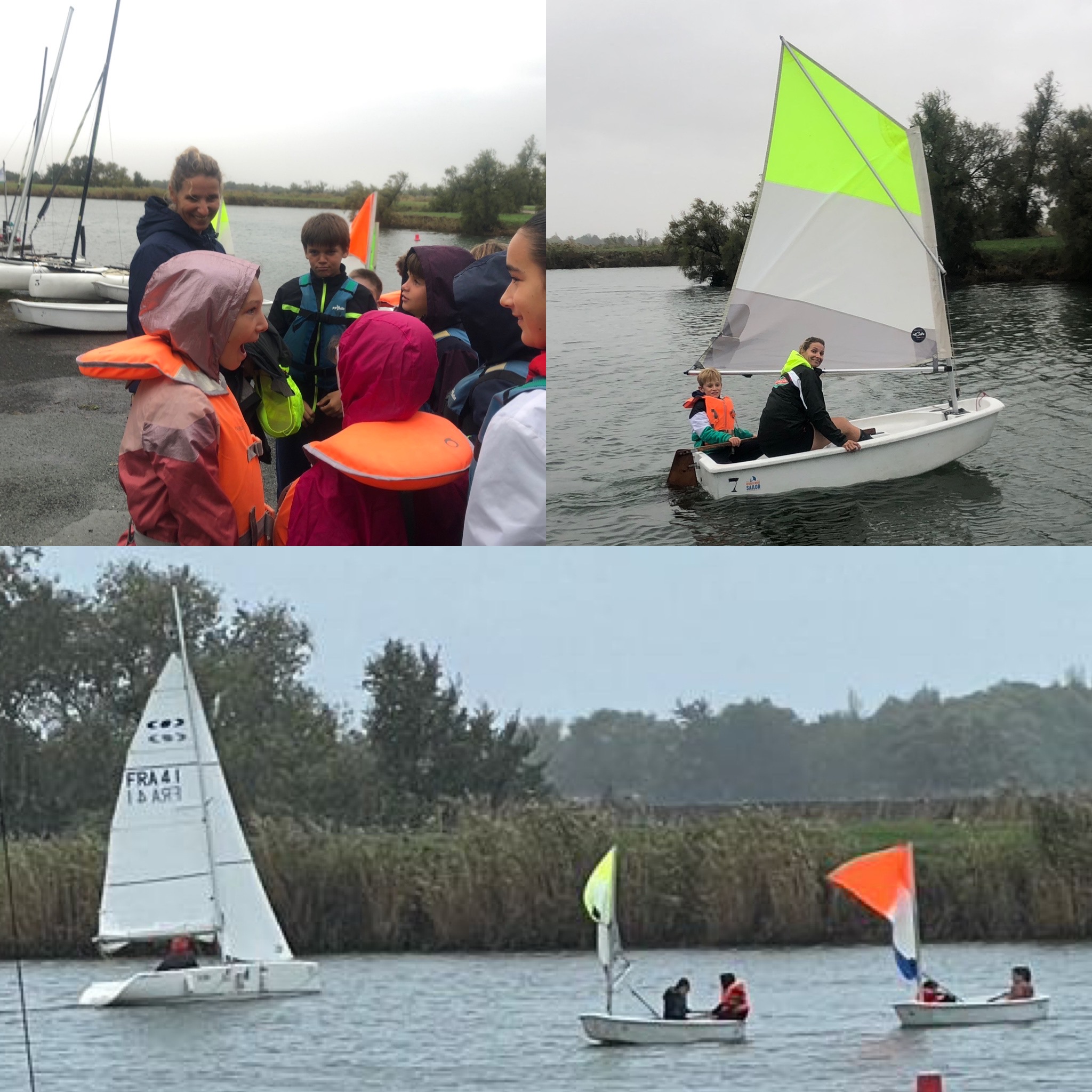Nous retrouvons Sarah une demi-heure après sur la plan d’eau de Marans à bord d’un optimiste avec un des élèves de la classe de CM2 de Yann, le directeur de l’école. Cette semaine est celle de la séquence EPS voile « inclusive ». Tous les élèves naviguent au sein de la même flottille, certains sur des optimistes d’autres sur un support handi-valide indispensable pour Aylisse qui a pu partager ainsi les mêmes émotions que ses camarades de classe. Personne ne s’est laissé impressionner par le vent qui s’est levé jeudi, ni la pluie aujourd’hui ! C’est ça aussi devenir navigateur et navigatrice !
