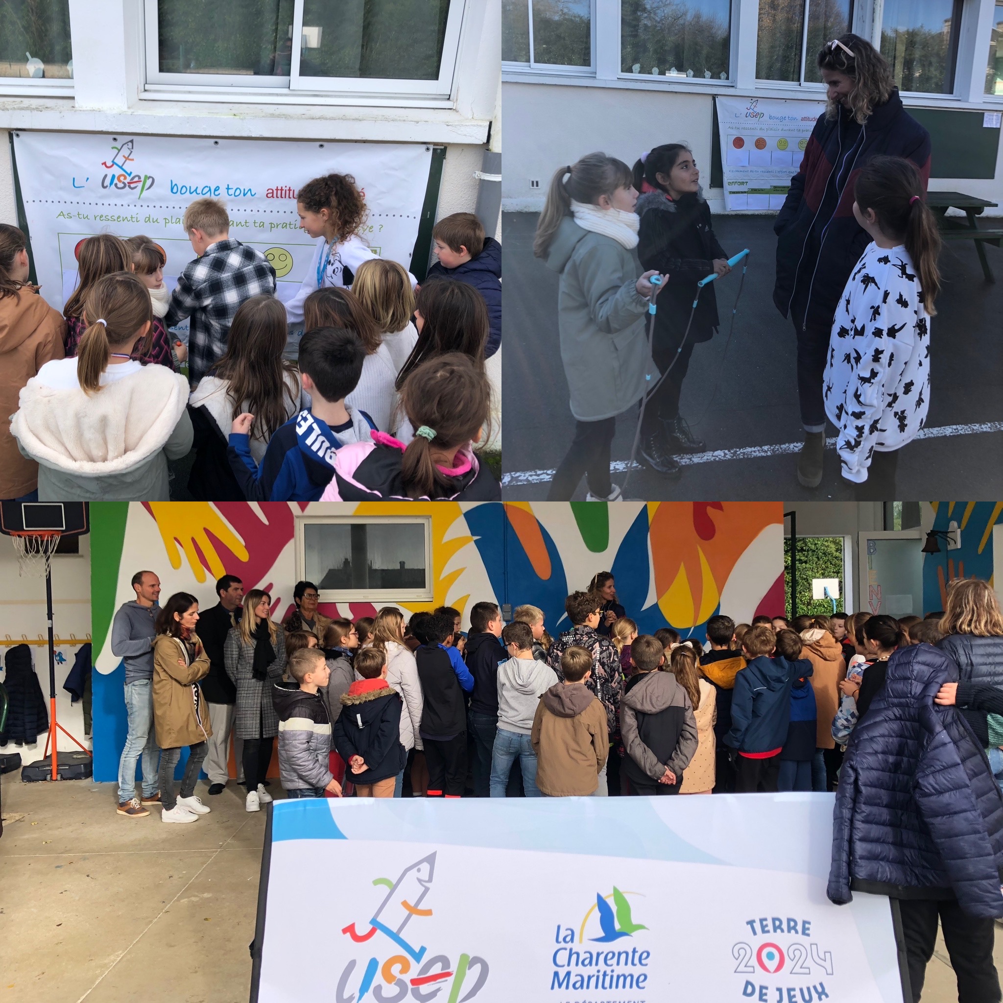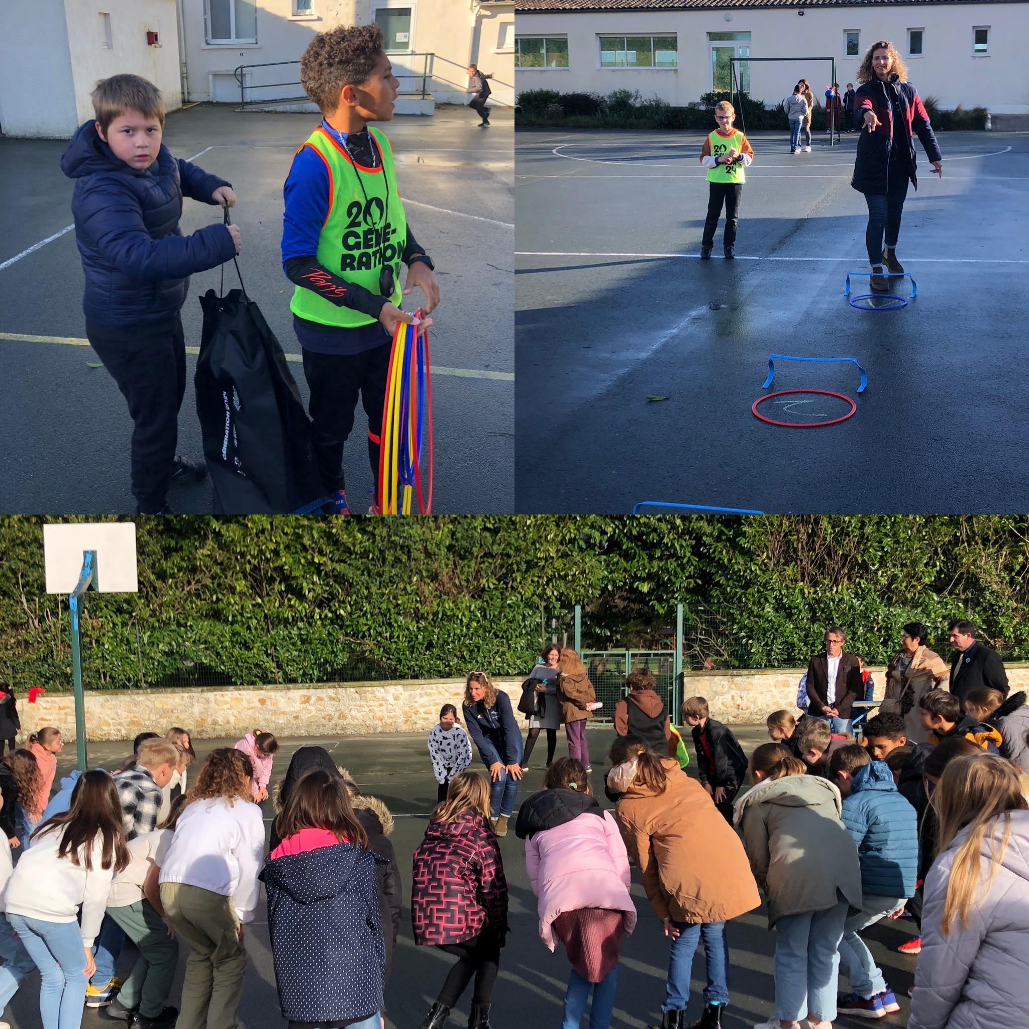 Il est 10h30 et c’est la récréation. Tous les élèves s’y retrouvent et quelques-uns, selon un planning qu’ils élaborent en autonomie, sont reconnaissables à leur chasuble Génération 2024 et au matériel (dont kit G24) qu’ils ont été récupérer pour mettre en place des défis récré usep . « Durant la semaine, on s’entraine et après on va inventer un défi qu’on enverra à l’USEP nationale ». Deux parcours sont mis en place tandis que quelques autres élèves sautent à la corde. La directrice comme Sarah sont entrainées dans l’aventure. Puis c’est au tour de Sarah de leur proposer de découvrir des exercices qu’elle utilise systématiquement pour réveiller son corps, avoir conscience de soi, se concentrer, s’équilibrer.