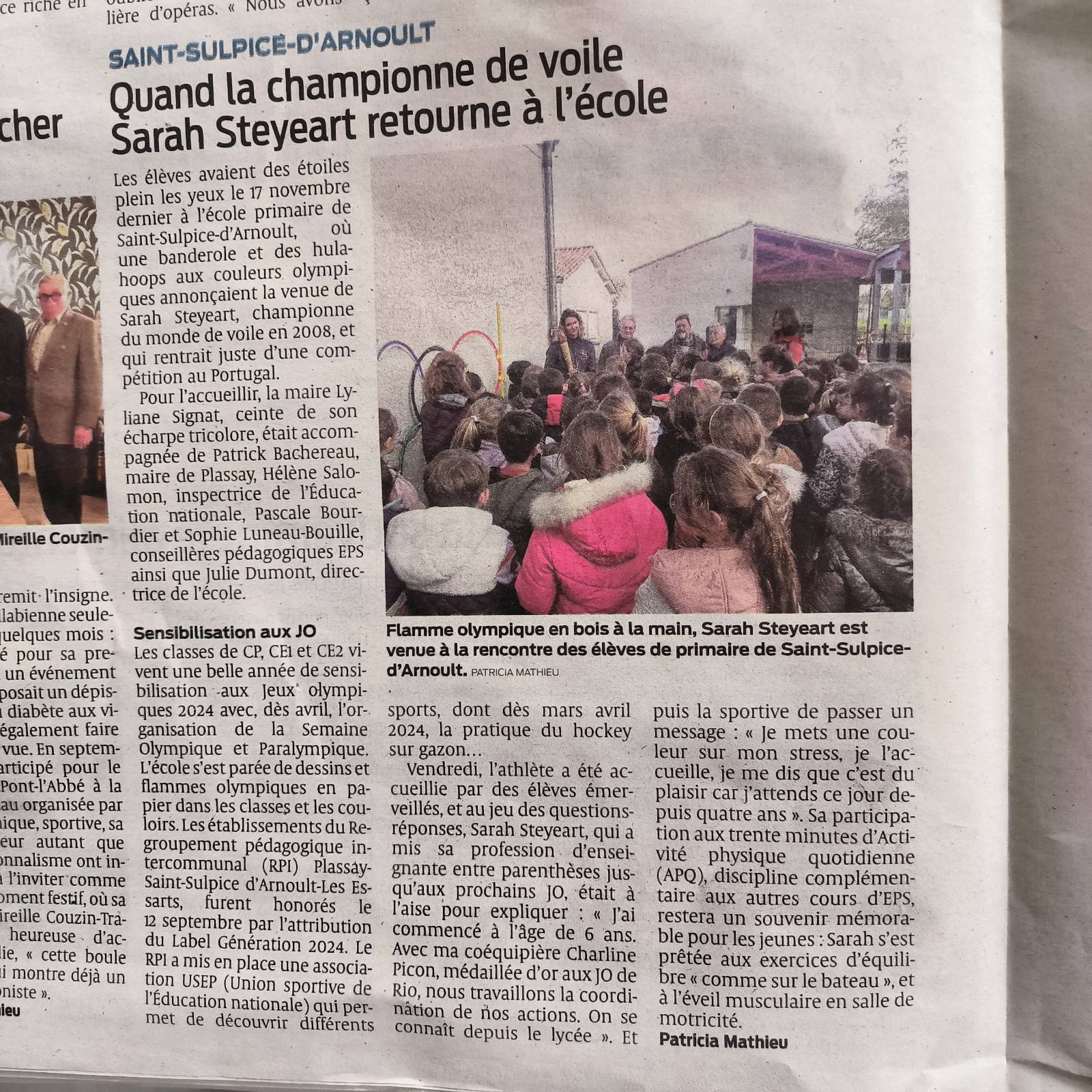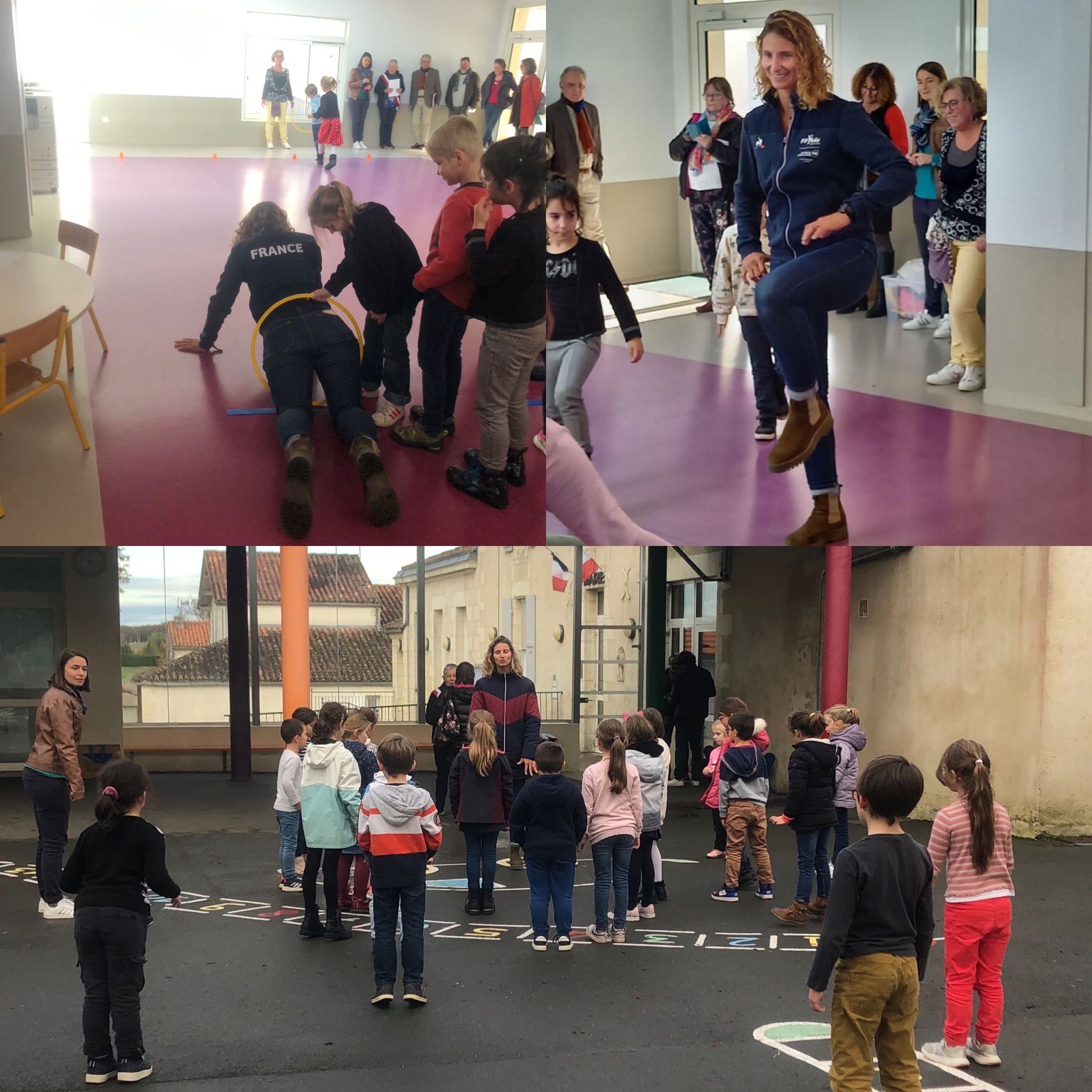 C’est une première de rencontrer une sportive de haut niveau, pour les élèves de cycle 2 de l’école de Saint Sulpice d’Arnoult. Alors avec leurs enseignants ils ont préparé ce moment. Les élus des communes du RPI, le représentant du SIVOS, l’inspectrice de la circonscription, la conseillère pédagogique en EPS sont présents et tous viennent encourager les élèves à pratiquer une EPS de qualité et une activité physique quotidienne en complément.