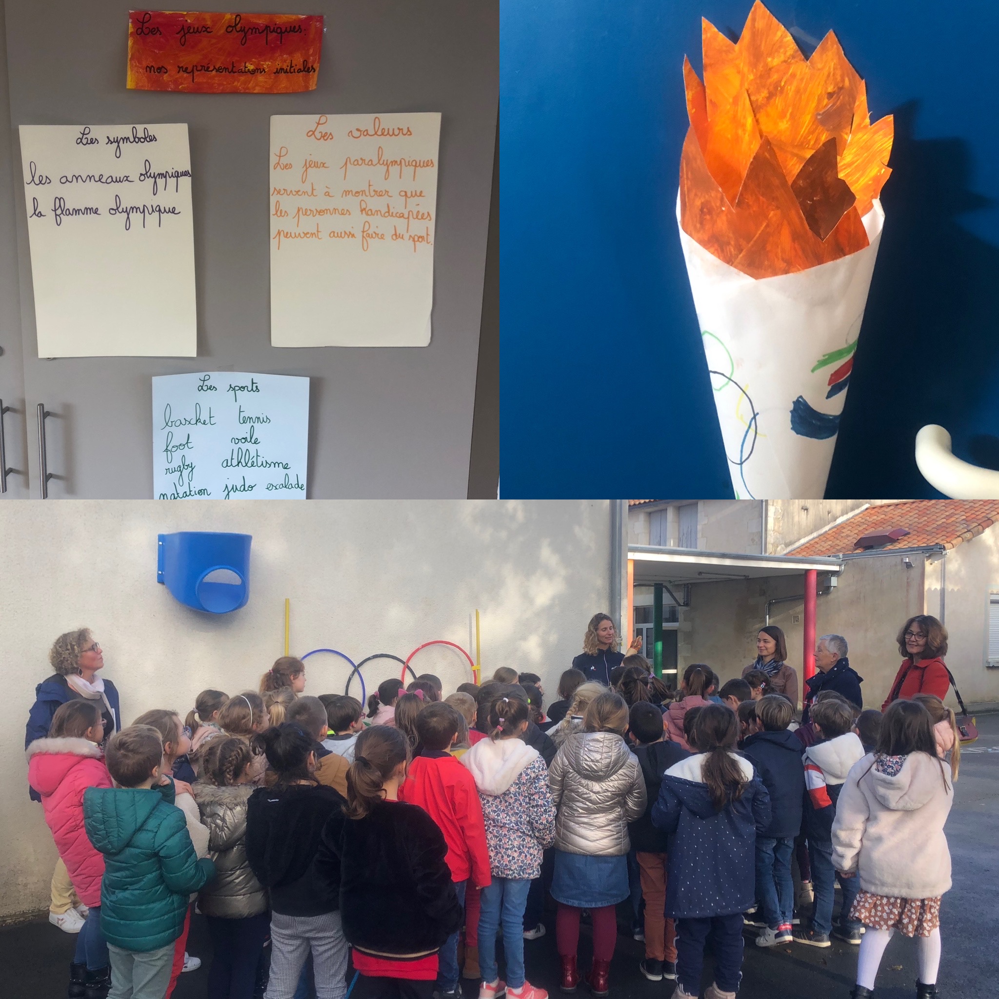 Les élèves de la classe de CE1 ont fait le point sur leurs représentations des JOP et tout au long de l’année, ils vont se documenter pour enrichir leurs connaissances, les partager avec les autres élèves. Les élèves ont décoré l’école avec des flammes olympiques qu’ils ont confectionnées. C’est l’occasion pour Sarah de leur raconter l’histoire de la flamme. « On pourrait courir avec, nous aussi » propose un des élèves.