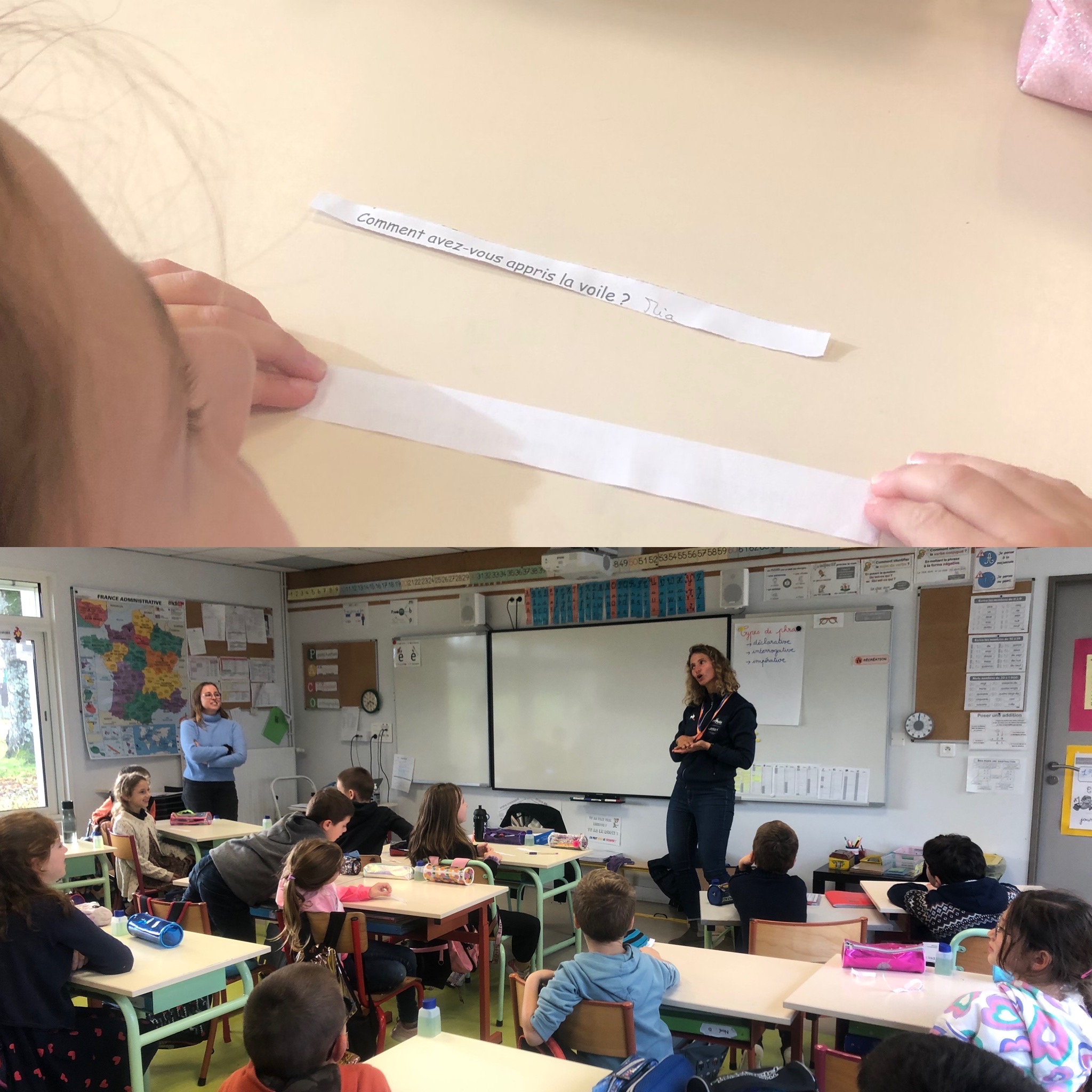 Même si les élèves ne font pas de voile, ils sont intéressés par les prouesses physiques de Sarah. « Comment tenez-vous l’équilibre ? Grâce à un trapèze, et des fois, je m’accroche aussi à mon équipière. Je travaille l’équilibre à terre sur des ballons et des planches. Je me prépare à être en instabilité ». « Est-ce que vous tombez ? Oui tous les jours et c’est chouette de tomber dans l’eau ! » « Comment faites-vous pour être concentrée? la concentration vient très vite sur le bateau, la difficulté c’est d’être coordonnée avec Charline pour aller dans la même direction. Coopérer avec Charline, c’est comme coopérer avec un camarade de classe. On essaie de se comprendre soi-même puis comprendre l’autre, nos points forts, nos faiblesses, ses points forts, ses faiblesses et on aide l’autre quand il en a besoin. Il faut apprendre à se parler, à dire ce que l’on ressent, accepter les difficultés de l’autre. On apprend comme vous. On se trompe, on tombe, on recommence. »