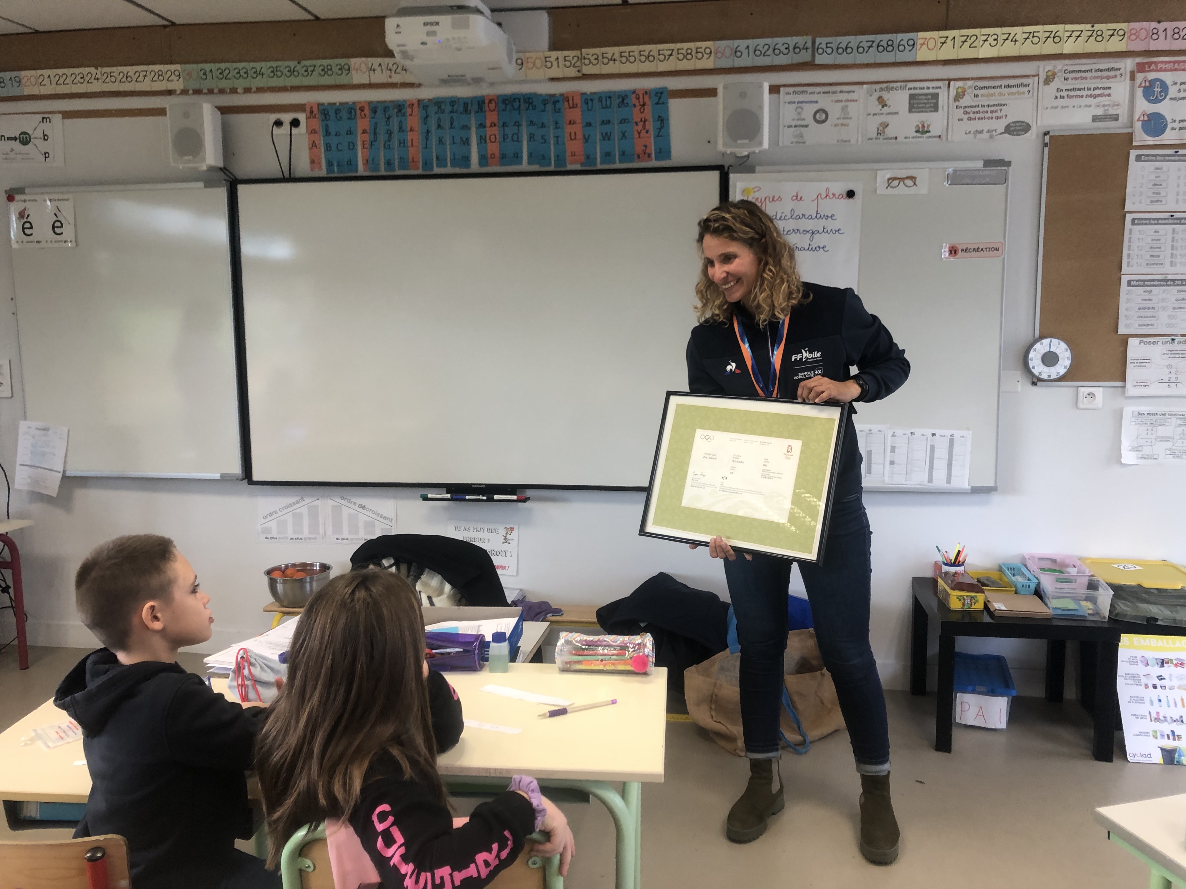 Sarah a réservé pour la fin quelques trophées qu’elle montre aux CE2: une médaille de championne de France, son titre de championne d’Europe, son « titre » de 5ème aux JO de Pékin.