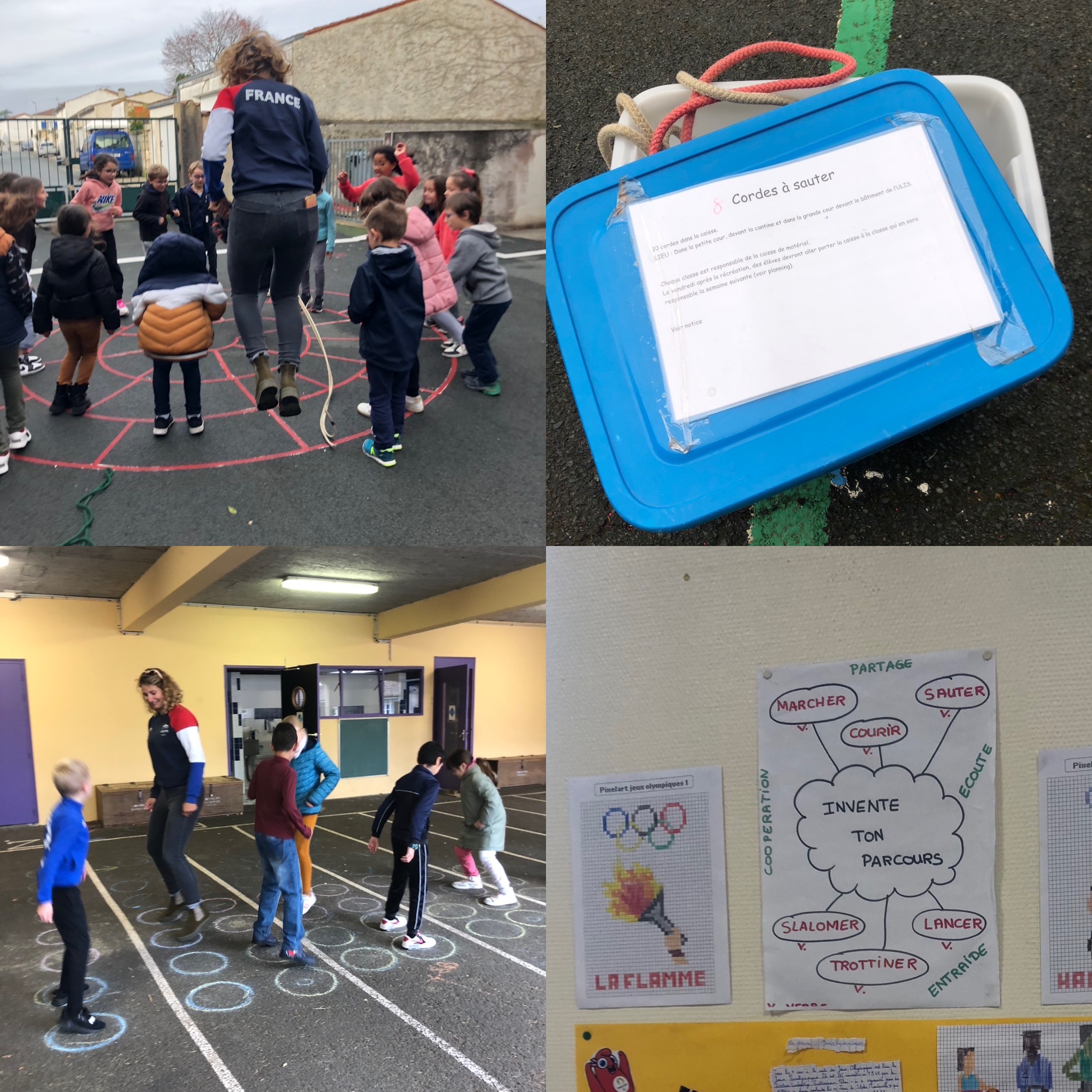 Dans la cour de récréation, l’organisation autonome des élèves pour s’engager dans une pratique physique est très efficace. L’équipe éducative a constitué des caisses contenant une fiche d’activité associée au matériel sportif nécessaire. Les élèves les utilisent comme ils le veulent. La récréation est active et dans tous les recoins de cette belle cour d’école ! La directrice précise « La récréation est maintenant plus sereine ». A ce moment un élève du dispositif ULIS vient saluer Sarah. « Comment vas-tu ? C’est toi Sarah ? ». Il parle anglais et échange quelques mots en anglais avec elle.
