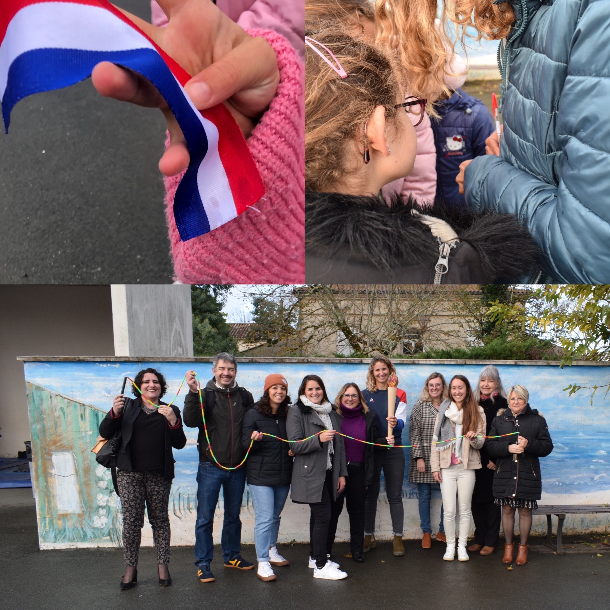 Avant de se quitter, petits et grands rejoignent la collation de fruits et d’eau offert par la municipalité. Des élèves demandent une autographe et le petit bout de ruban bleu blanc rouge qui s’échappe de la poche de Sarah est vite récupéré par une des élèves qui l’entoure !