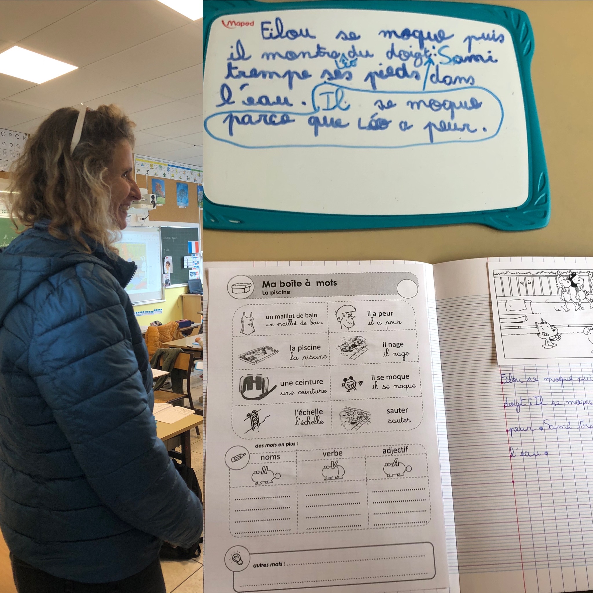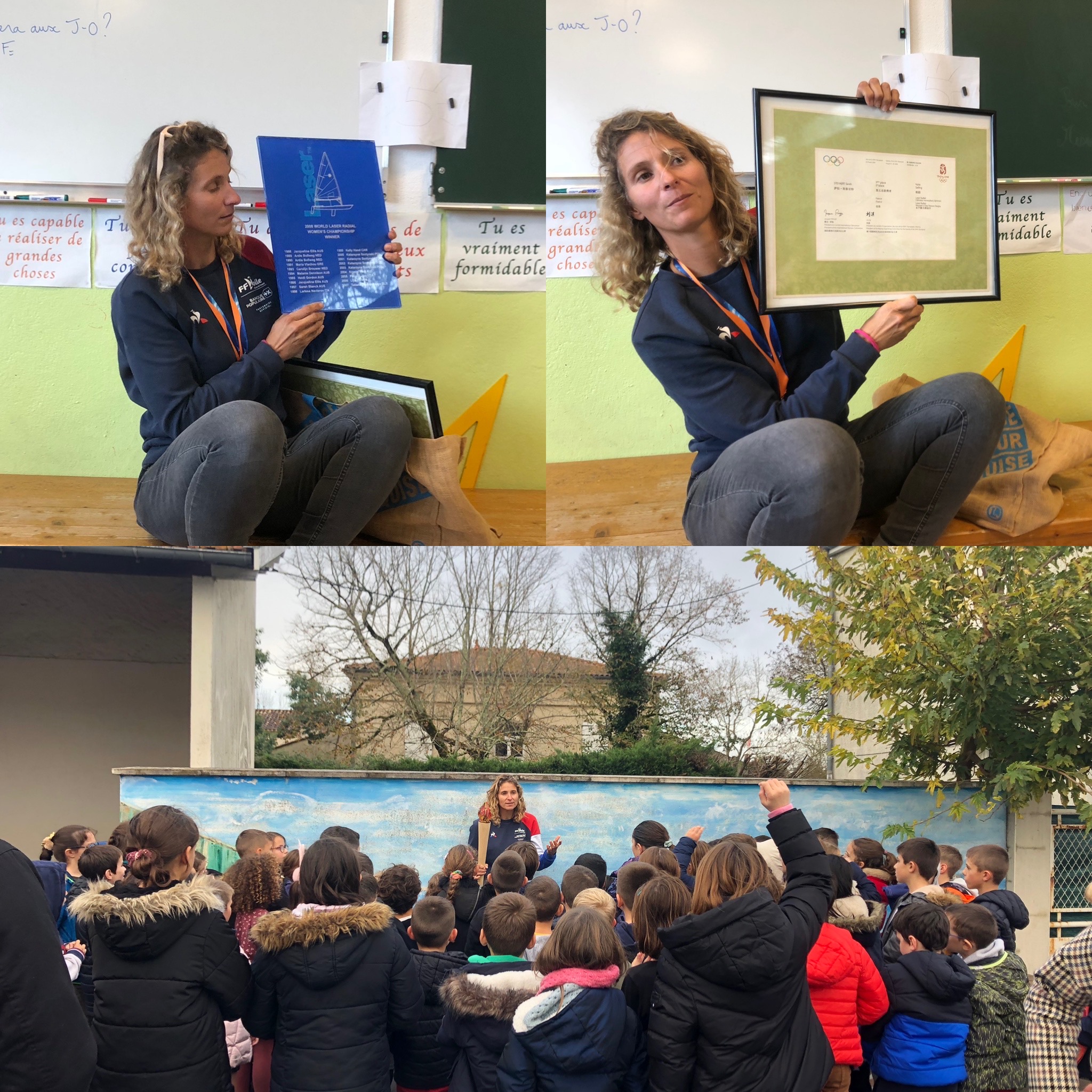 La visite commence par la classe de CP-CE1, qui travaille en français sur une histoire dont la thématique est la natation, actuellement programmée sur le bassin des Antilles de Jonzac et financée par la CDC Haute-Saintonge. « Pour pratiquer mon sport, il faut savoir nager. Savez-vous de quoi il s’agit ? ». Les élèves veulent savoir si son bateau se retourne. « Oui mais on le remet droit et on peut rentrer au port, on ne dort pas sur mon bateau. Il y a des bateaux pour faire du sport comme le mien et des bateaux pour se promener qui ne se retournent pas. Nous avons un entraineur qui nous aide pour redresser notre bateau ».