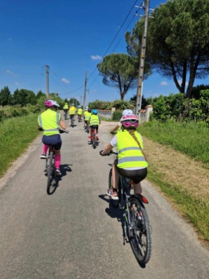 Nous, les douze élèves de la classe de CM2 de Courcoury et les six adultes accompagnateurs, sommes partis de Courcoury sous les encouragements des parents et du journaliste de Sud-Ouest. L’un des adultes conduisait le fourgon que le papa d’Irène avait prêté pour transporter les affaires de camping et nos valises. Il y avait aussi 3 vélos de remplacement au cas où nous aurions un souci technique. On a fait 40 km en une matinée. Nous avons mangé notre pique-nique au parc de Pont-L’abbé d’Arnoult puis on a fait le parcours Terra Aventura de la commune par petits groupes. La maîtresse nous a acheté des glaces pour le goûter. Ensuite, nous avons installé les tentes tout seuls le long du terrain de football et nous sommes partis dîner au restaurant le Grain de sel vélo. Les assiettes étaient très bien présentées et tout était délicieux. Le chou était énorme. De retour, nous avons pris nos douches et fait quelques jeux avant de nous coucher. Angèle et Louise