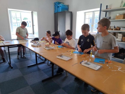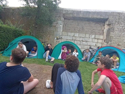 Nous avons plié les tentes pour aller prendre le petit déjeuner au Grain de Sel, une grande table nous attendait avec des céréales, des œufs brouillés, de la charcuterie et de la viennoiserie, une salade de fruits. C’était incroyable et délicieux. Nous sommes partis le ventre bien plein pour pédaler. Nous avons fait 8 km pour aller à l’Abbaye de Trizay, c’était très facile et nous avons fait à nouveau 8 km pour prendre le goûter avant d’emprunter le pont transbordeur pour aller au camping de Rochefort. Nous avons fait un atelier enluminure : notre initiale avec des pigments naturels, comme les moines avant, et nous avons décoré le reste. L’après-midi, nous avons travaillé sur l’architecture du site et tracé des formes géométriques avec des cordes. Notre déjeuner était un pique-nique préparé par le Grain de Sel. Au camping de Rochefort, nous avons mis les tentes, on a joué un peu, nous sommes allés manger à l’auberge de jeunesse à vélo, puis nous sommes rentrés faire un loup garou (c’est un jeu que nous aimons beaucoup) et nous sommes allés nous coucher. Journée bien remplie. Léo et Ian-Arthur