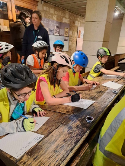 La maîtresse a dû nous réveiller car nous dormions encore (les autres matins, nous nous levions avec le soleil). Nous avons rangé tout le matériel sans faire de bruit pour ne pas réveiller les emplacements voisins. Nous sommes allés visiter le Musée des Métiers d’Autrefois. Le guide nous a tout très bien expliqué. L’invention du plastique a révolutionné beaucoup de choses, comme la brosse à dents qui était en bois avant. Dans la classe, nous nous sommes assis à des pupitres et avons écrit un texte à la plume et avec l’encrier. C’était dur. A Tonnay-Charente, nous avons quasiment tous réussi à monter la grosse côte qui permet d’accéder au pont suspendu, nous étions très fiers de nous et les adultes aussi ! Nous avons ensuite gagné St Hippolyte pour y pique-niquer et roulé jusqu’à Plassay, la route était longue (comme celle du lundi) et il y avait des toboggans (des côtes suivies de descentes, puis à nouveau des côtes). Sur la route, Louise est tombée et elle n’a pas pu remonter jusqu’au lendemain car son casque s’est fendu. On a bien compris à quel point le casque est important à vélo ! Nous sommes allés à la carrière de la SECTP qui extrait du calcaire. Du haut du promontoire, c’était très impressionnant. Nous sommes montés tous ensemble sur la balance des camions puis dans le godet d’un énorme chargeur. Impressionnant encore ! Monsieur Lefort nous a offert des gobelets et des crayons et une affiche expliquant le fonctionnement de la carrière. Nous allions ainsi pouvoir comparer avec l’extraction au XIXème siècle vendredi. Au camping de Le Mung, nous avons encore installés les tentes … et expliqué à la petite fille des propriétaires qui faisait du vélo sans casque que c’était dangereux. Sa maman nous a remerciés le soir car, grâce à nous, elle porte son casque désormais. Nous avons mangé le repas commandé par Mattéo : steak frites et glaces ! Après, nous avons fêté l’anniversaire de Liam et fait une boum. C’était trop bien ! La maîtresse nous a même offert à chacun une médaille de participation et réussite à ce séjour. Corentin et Mattéo