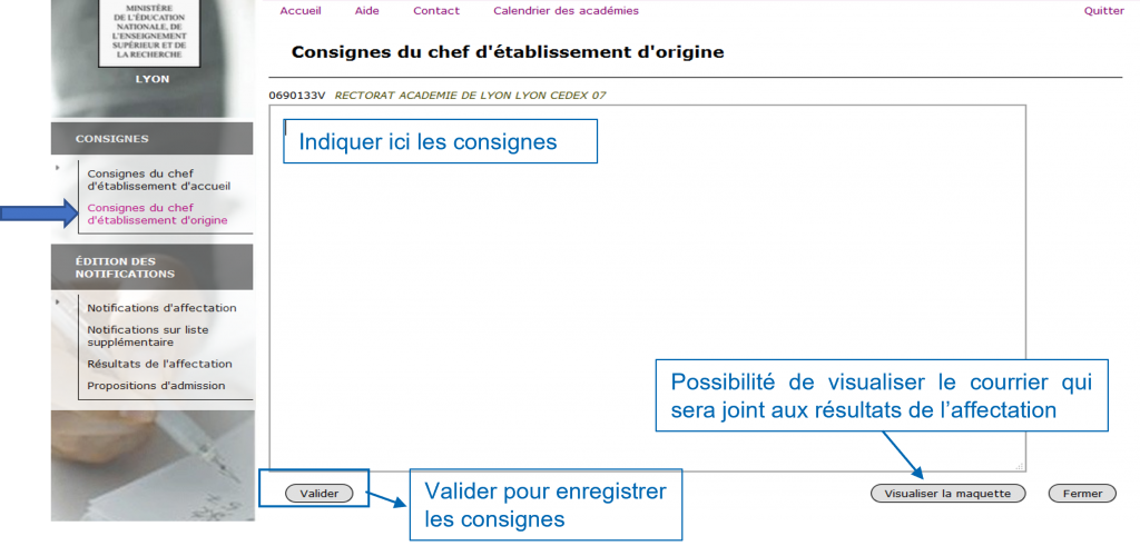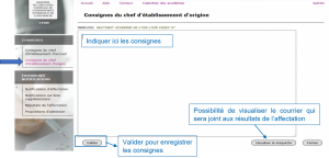 – En cas d’utilisation des consignes, la validation est obligatoire, même si le contenu n’a pas évolué, pour permettre l’édition des notifications en établissement et sur le service en ligne Orientation.