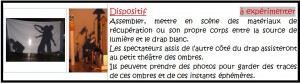 Création d’ombres en utilisant différents dispositifs : rétroprojecteur, épiscope, projecteurs et filtres de couleurs, écran blanc, noir, draps, matériaux de récupération (cartons, polystyrène, pâtes pour la soupe en forme de lettres, graines, papiers découpés…)