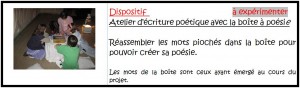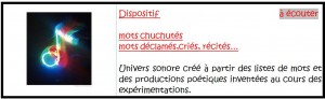 Création de notre boîte sonore à chochotements: prise de son des listes de mots ayant émergé ( scother, attacher, accrocher, percer…)et de nos productions poétiques.