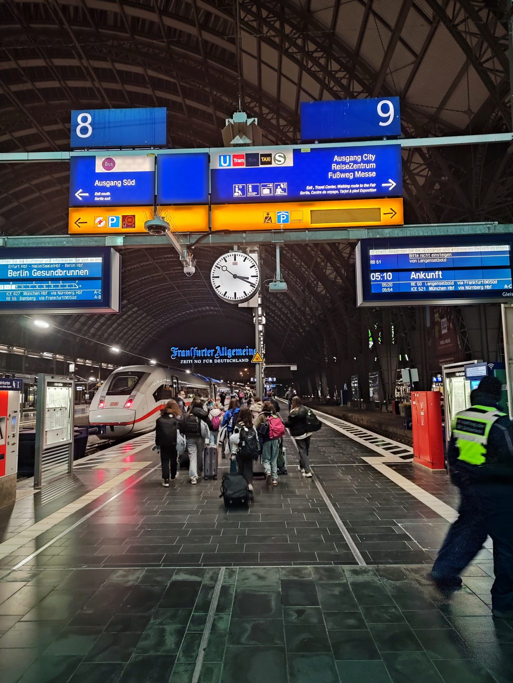 20h40 : le retard est actualisé à 2h, soit un départ vers 21h06. On espère maintenant pouvoir monter dans le train suivant pour Berlin qui partirait de Francfort vers 3h et arriverait à 8h. Le repas a été pris calmement dans la gare.